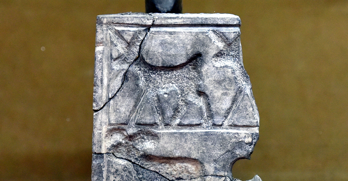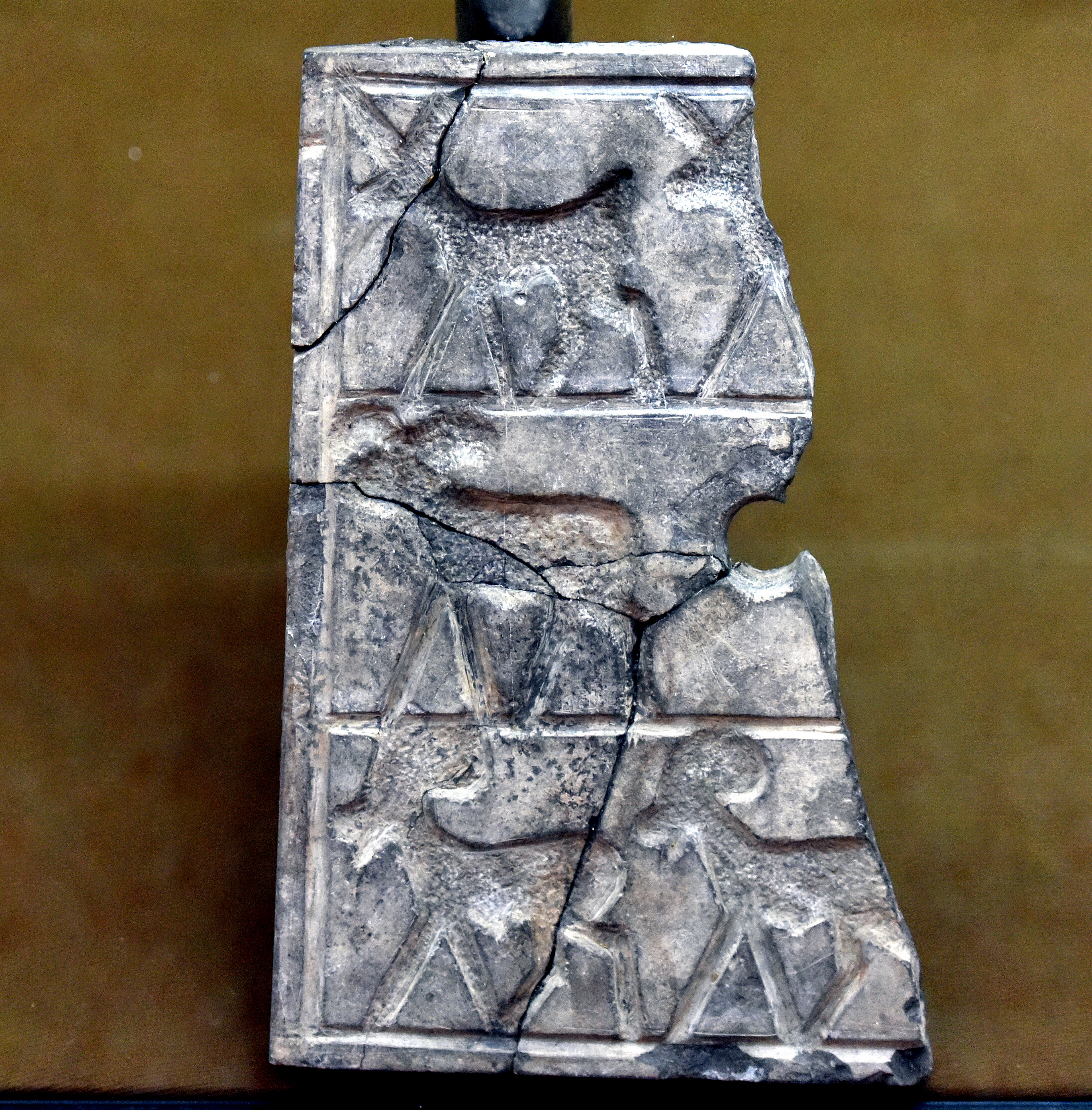 This bituminous stone plaque was found in fragments. It was excavated by the Oriental Institute of the University of Chicago in the early 1930s; the different fragments were collected during the 1st and 3rd seasons. It depicts processions of four-legged and horned animals (in sunken reliefs) in three horizontal registers. There is a rounded hole at the middle for wall fixation. Early Dynastic period, 2600-2370 BCE. From the Temple Oval at Khafajah (ancient Tutub), Iraq. On display at the Iraq Museum in Baghdad, Republic of Iraq.