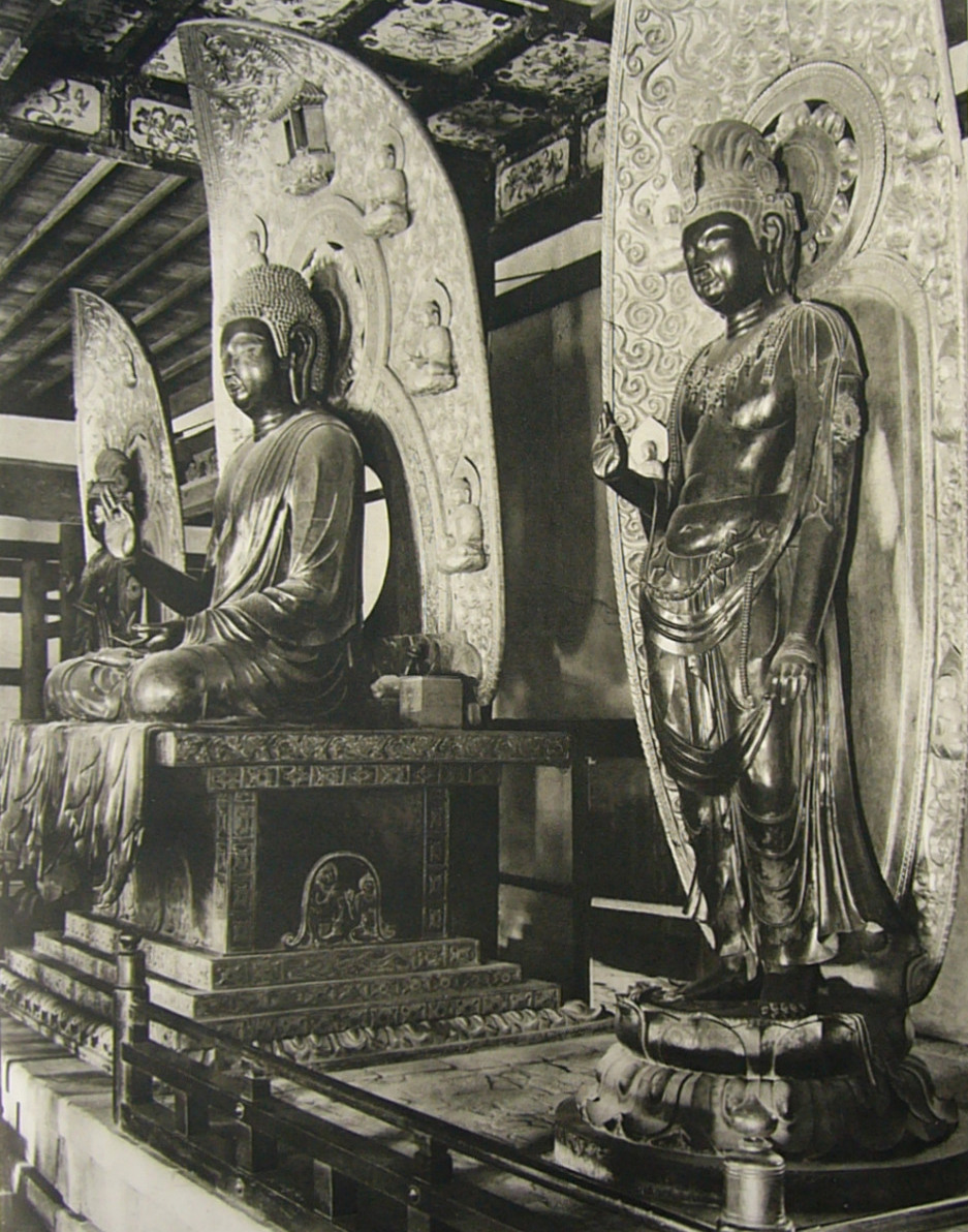 The Yakushi Triad in the Main Hall of Yakushiji temple, Nara, Japan. Bronze, 680-718 CE. Yakushi Nyorai is the Buddha of healing and the seated figure is flanked by two bodhisattvas. The Yakushi figure is 4.3 metres (14 ft.) in height.