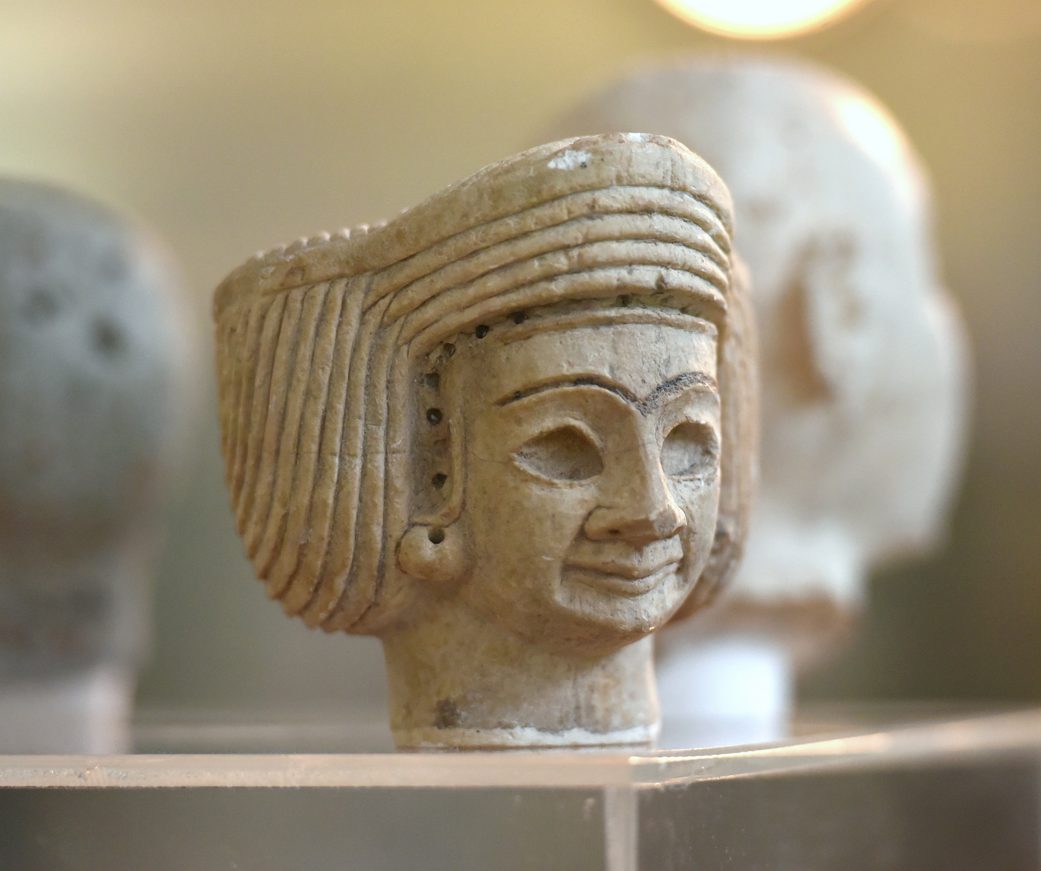 Head of a statuette of a Sumerian female worshiper from the Shara Temple at Tell Agrab, Mesopotamia, Iraq. Early Dynastic period, c. 2400 BCE. Excavated by the Oriental Institute of the University of Chicago in 1930s. On display at the Iraq Museum in Baghdad, Republic of Iraq.