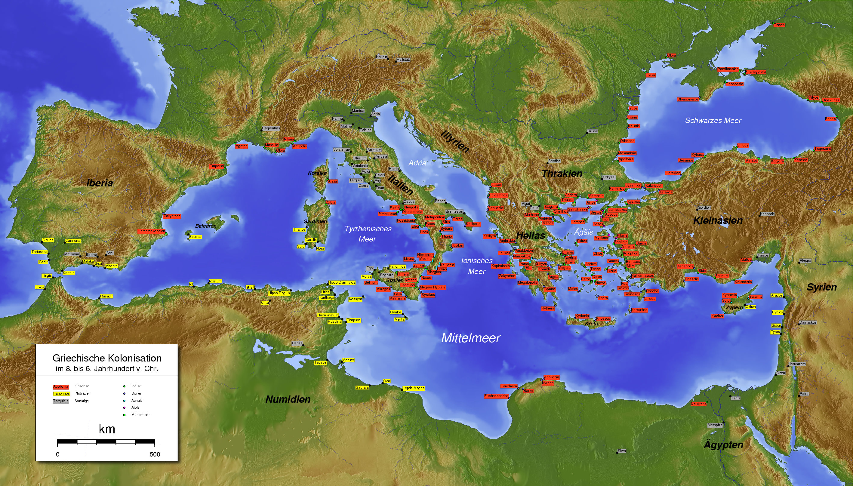 Greek (Red) and Phoenician (Yellow) colonization between the 8th and the 6th century BC. German placenames.