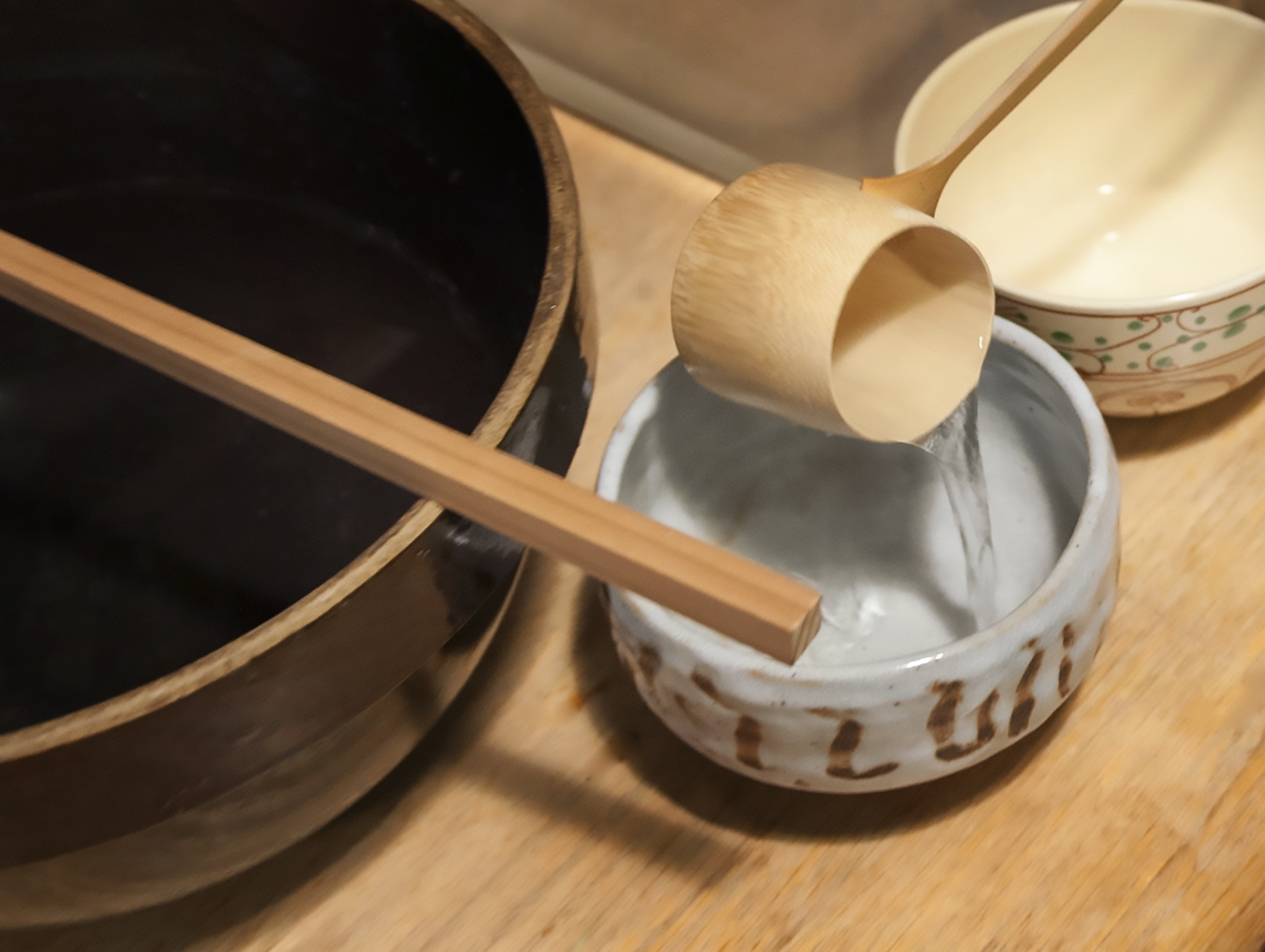A hishaku (bamboo ladle) and chawan (bowl) used in the Japanese tea ceremony. Before mixing the tea the bowl is rinsed with fresh water.