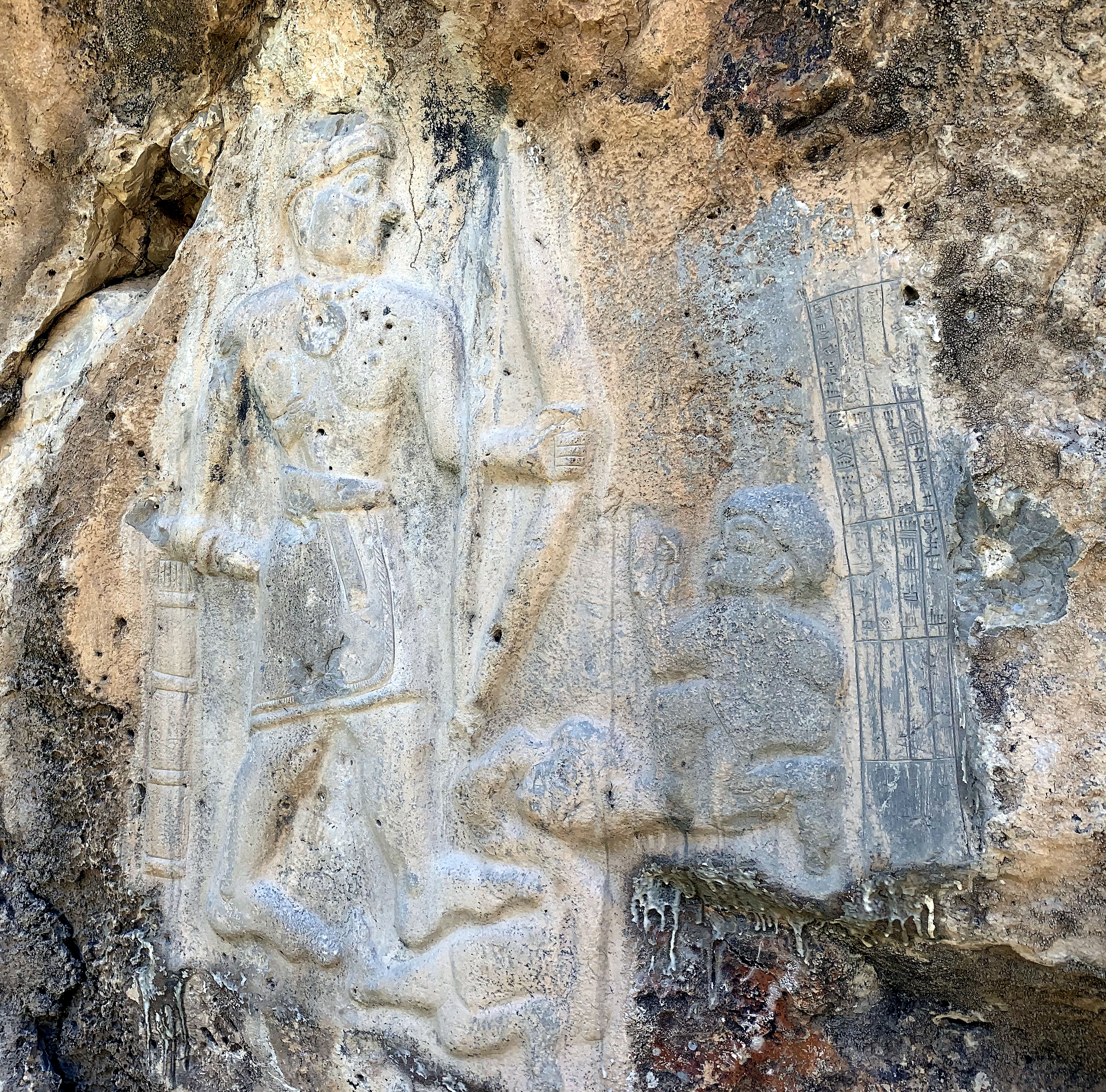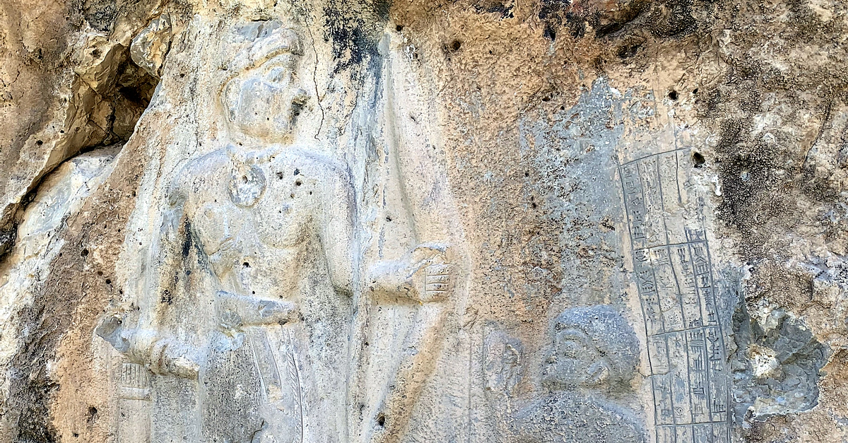 This rock-relief depicts a triumphant warrior. Before him, two captives (probably Hurrians) can be seen. The Akkadian cuneiform inscription on the right side mentions the name of the warrior as "Tar...dunni", son of Ikki. The names of the gods, Shamash and Adad, were mentioned also. "Tar...dunni" might have been a local king, prince, ruler, or a high-ranking official, probably Lullubian. The exact dates of these individuals and their lives are unknown. Darband-i Belula (Belula Pass), Sulaymaniyah Governorate, Iraqi Kurdistan. Akkadian period, 2350-2006 BCE.