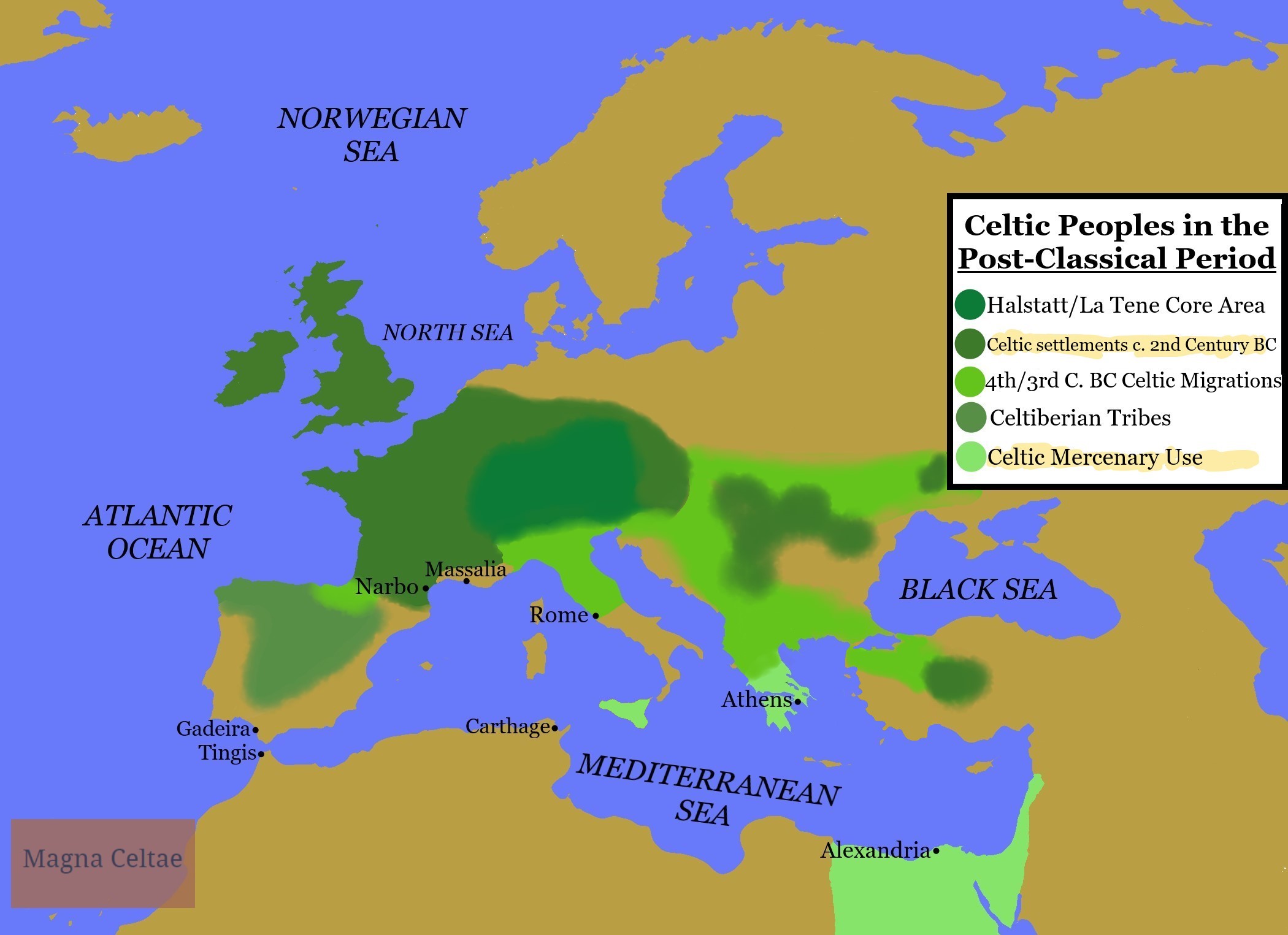 A map showing the spread of Celtic-speaking peoples in Europe, and their migrations in the Post-Classical Period.