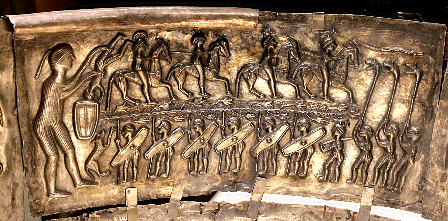 This scene from the interior of the Gundestrup Cauldron is usually interpreted as a scene of rebirth. On the bottom, a line of Celtic infantrymen march to a figure on the left of the register who is probably a war god. These infantrymen are followed by a warrior with a boar helmet and three carnyx players. The god is dipping a man in a cauldron of rebirth, while mounted warriors or chieftains in the top register ride off to the right, away from the god. The scene may signify the hope of achieving a higher social status in the afterlife. The Gundestrup Cauldron was discovered in a bog in Jutland, Denmark. However, the cauldron includes elements and iconography which derive from Celtic, Thracian, and Asian cultures. The piece is subject of various interpretations and was probably made in sometime between 200 BCE and 300 CE.