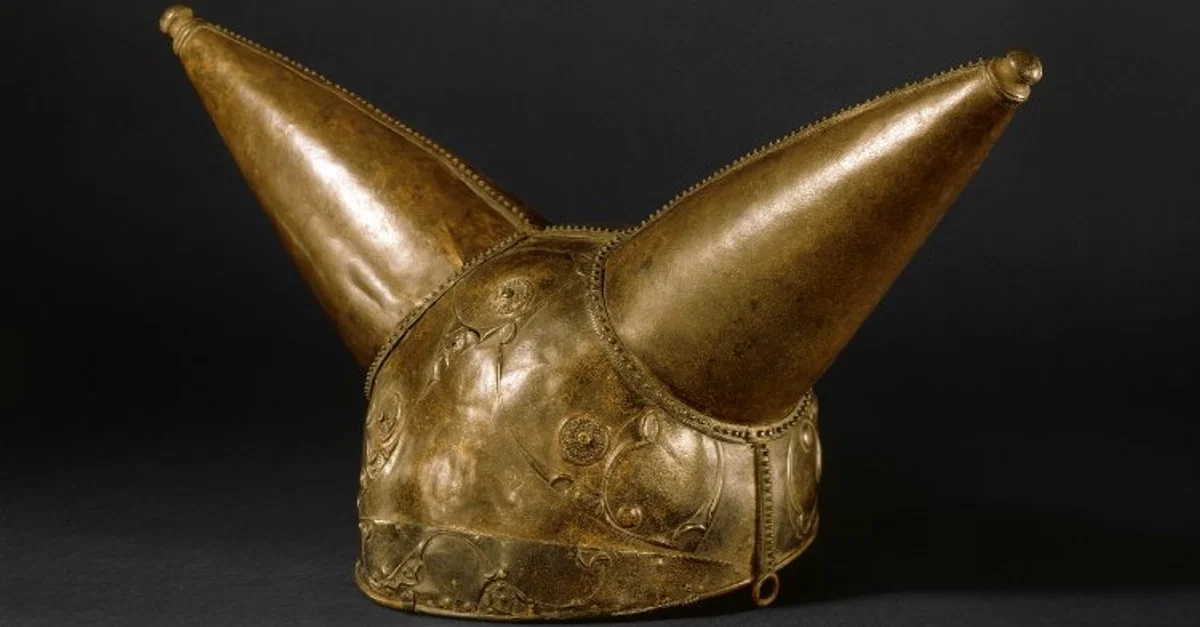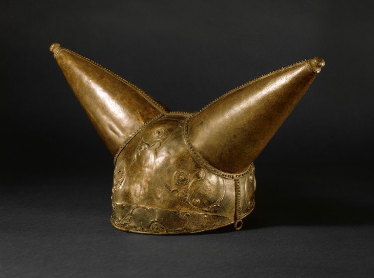 The "Waterloo Helmet" is an example of a ceremonial horned helmet from Celtic La Tene culture. The helmet was originally decorated with pieces of red glass, and would have been even more visually striking when it was made. It is impractical for use in combat, and was probably only used for ceremonial purposes, possibly in processions or parades. The bronze helmet was made c. 150 - 50 BCE, and was found in the Thames River near the Waterloo Bridge, England. It is the only example of an Iron Age horned helmet to be found in Europe, and the only Iron Age helmet to be found in southern England. The Waterloo Helmet is on display in the British Museum in London.