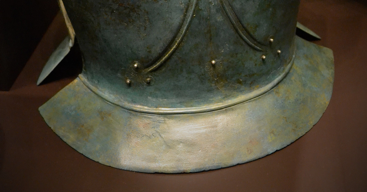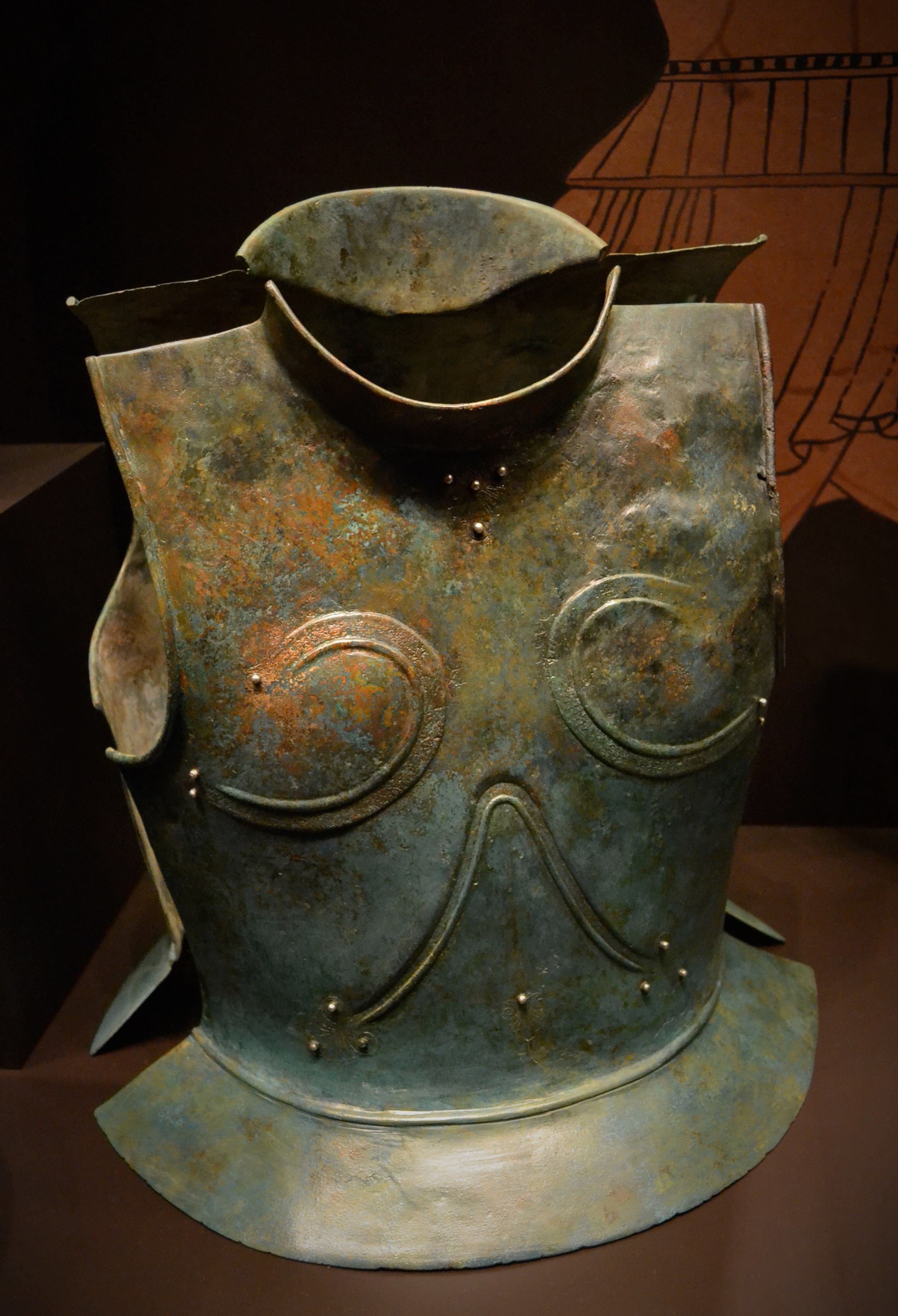 A Greek "bell cuirass" from the Archaic Period, made sometime between the 7th and 6th Century BCE. This cuirass came from the Greek mainland and was the antecedent to the later and more recognizable "muscle cuirass". This breastplate is in the National Archaeological Museum of Spain.