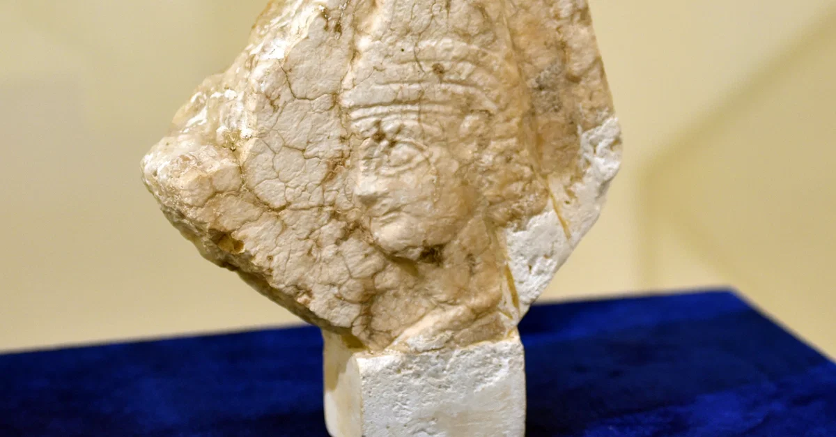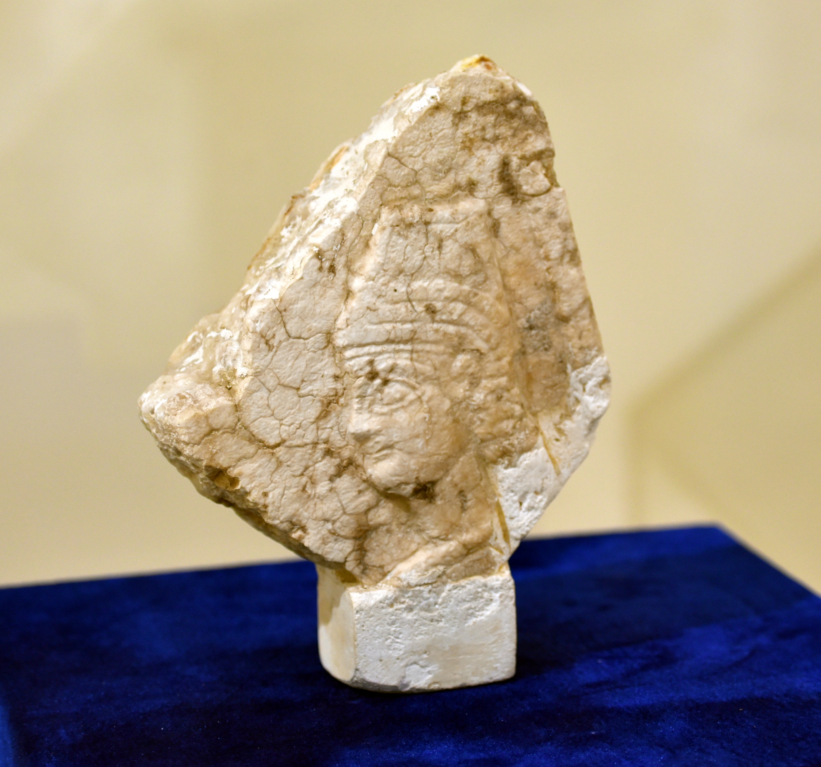 Limestone stele fragment depicting a woman looking to the left and wearing a headdress of the royal women. From Kli'eh, near Haditha Dam, Al-Anbar Governorate, Iraq. Neo-Assyrian Empire, 911-612 BCE.