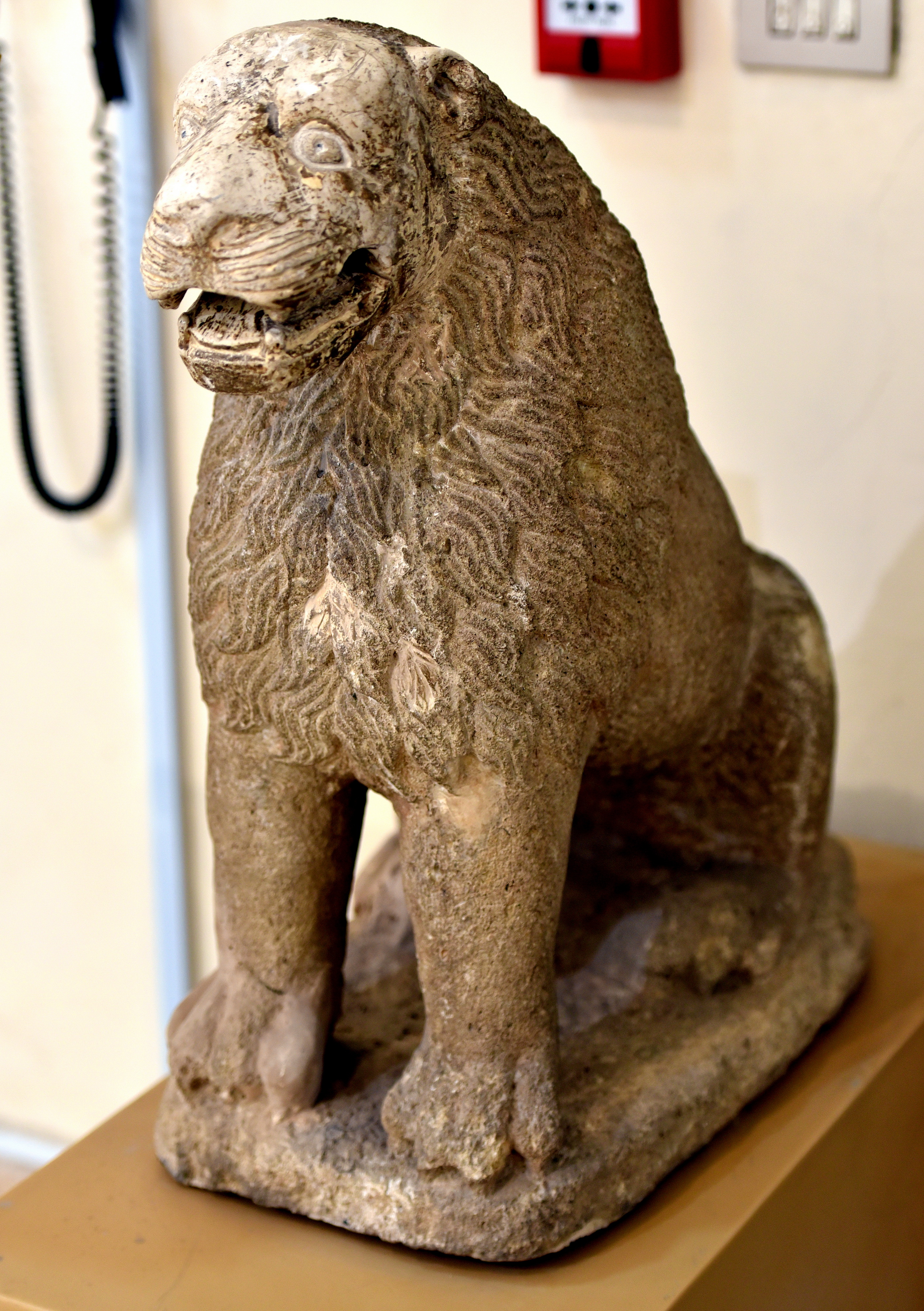 This limestone statue of a lion (of a pair) was guarding the main entrance to the 4th temple at Hatra dedicated to the goddess Ishtar. From Hatra, Ninawa Governorate, Iraq. Parthian period, 1st to 3rd century CE . On display at the Iraq Museum in Baghdad, Republic of Iraq.