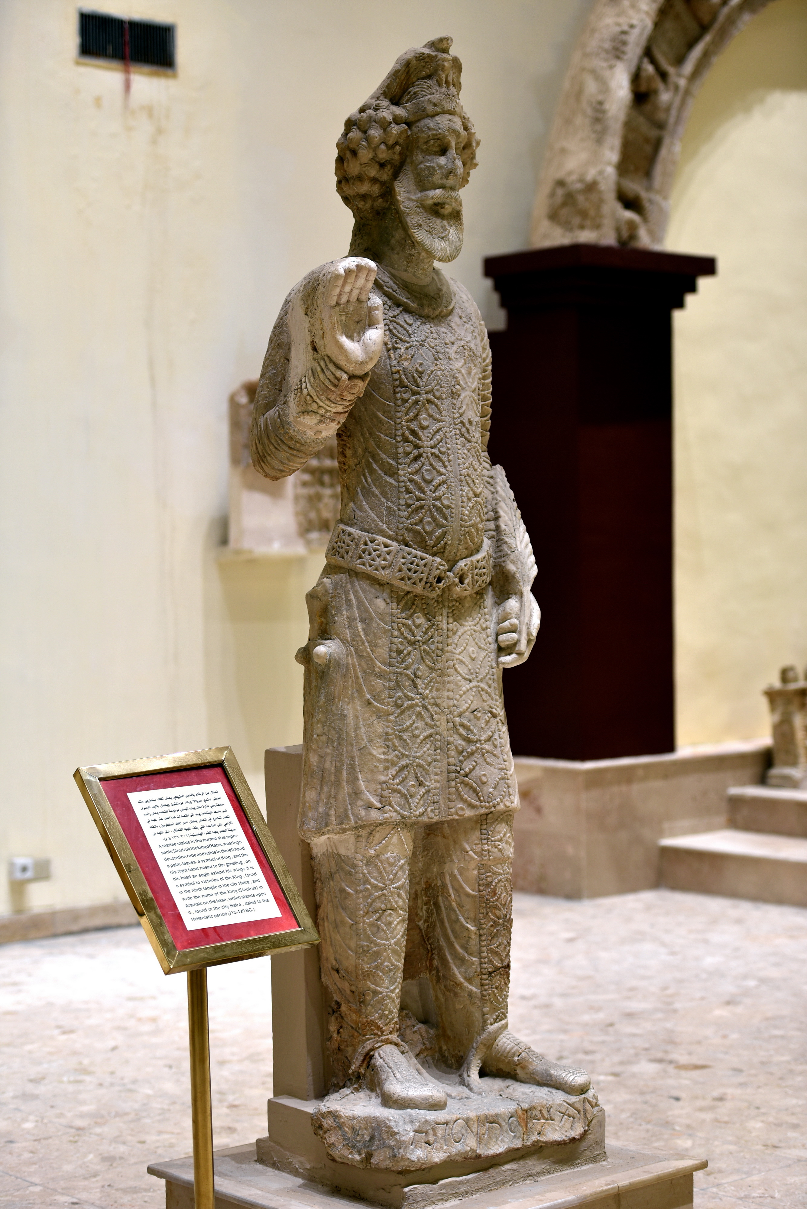 This is, a little bit larger than a life-size, marble statue of Sanatruq I (reigned c. 140 - 180 CE), king of Hatra. The king wears an exquisitely carved dress and a headdress of an eagle. His right hand is raised in salutation while the left one holds a palm branch, a symbol of victory and blessing. It was found in the 10th temple at Hatra. The name Sanatruq appears in the Aramaic inscription on the base of the statue. From Hatra, Ninawa Governorate, Iraq. Parthian period, 2nd century CE. On display at the Iraq Museum in Baghdad, Republic of Iraq.
