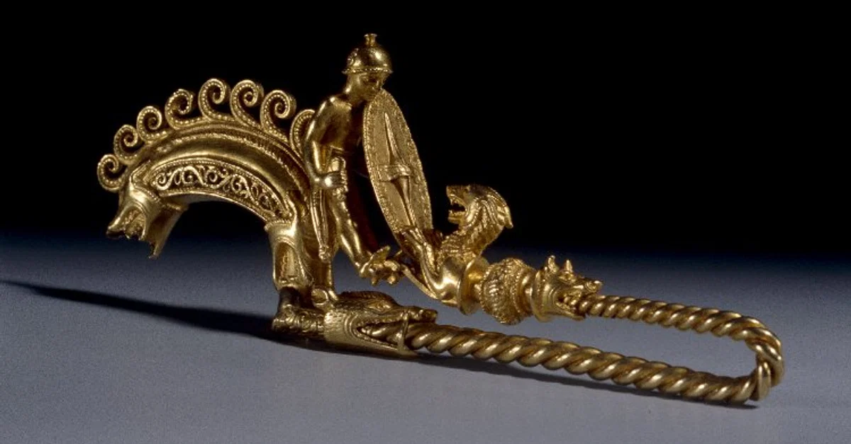 A 3rd Century BCE gold fibula depicting a Celtic warrior. A Celtic warrior with a sword, oval shield, and pointed helmet is depicted defending himself from a dog which is jumping on him, two other dog heads are on each end of the fibula. The fibula originally had blue glass enamel fittings along the sides and in the eyes of each figure.