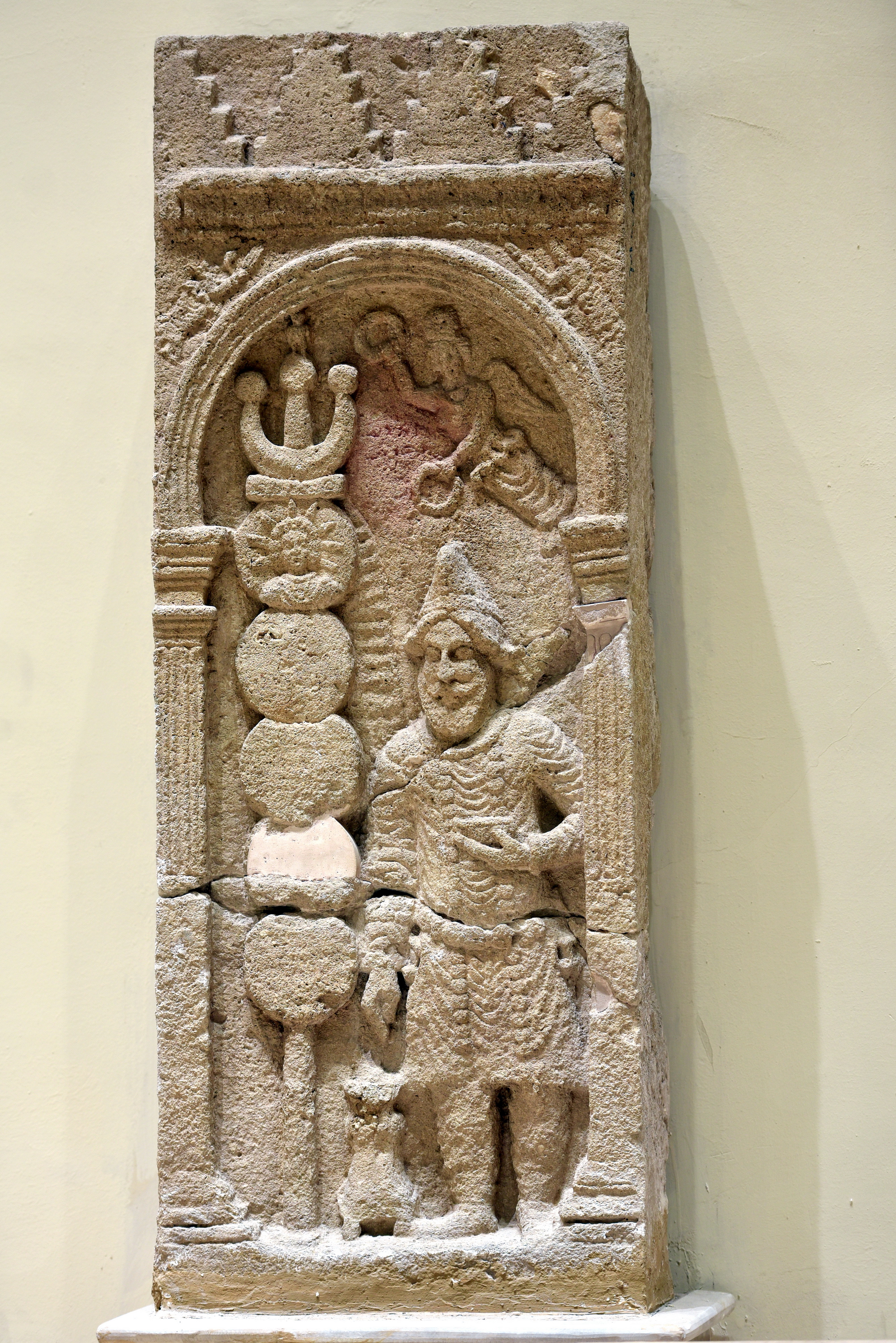 This limestone slab was carved in prominent sunken relief and depicts a temple ritual scene. A male figure wearing the head cap of Hatrene kings (very probably Sanatruq I who reigned c. 140 - 180 CE), holds a small bowl in his left hand while putting incense into the censer on his right side using his right hand. An eagle is perched on the middle arm of a trident object atop a standard of five discs (only the upper disc depicts a male figure with radiating lines from his head). Besides the standard, a small Aramaic inscription of two words can be recognized (Smiya Makna, which translates to the flag of discs). Above Sanatruq I, a winged female deity holds rings of blessing in her hands. The scene is encompassed by columns and an Iwan-like arc. On both sides of the arc, a winged female deity also appears. Above the arc, there is a frieze of acanthus plant and turret-like triangular structure. From Hatra, Ninawa Governorate, Iraq. Parthian period, 2nd century CE. On display at the Iraq Museum in Baghdad, Republic of Iraq.