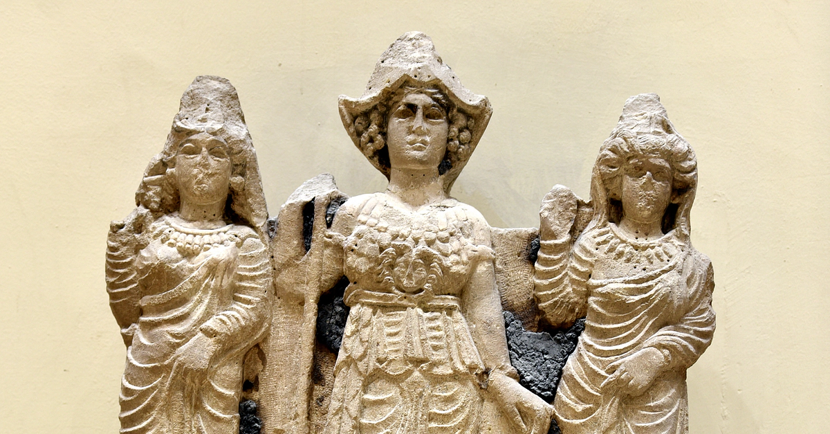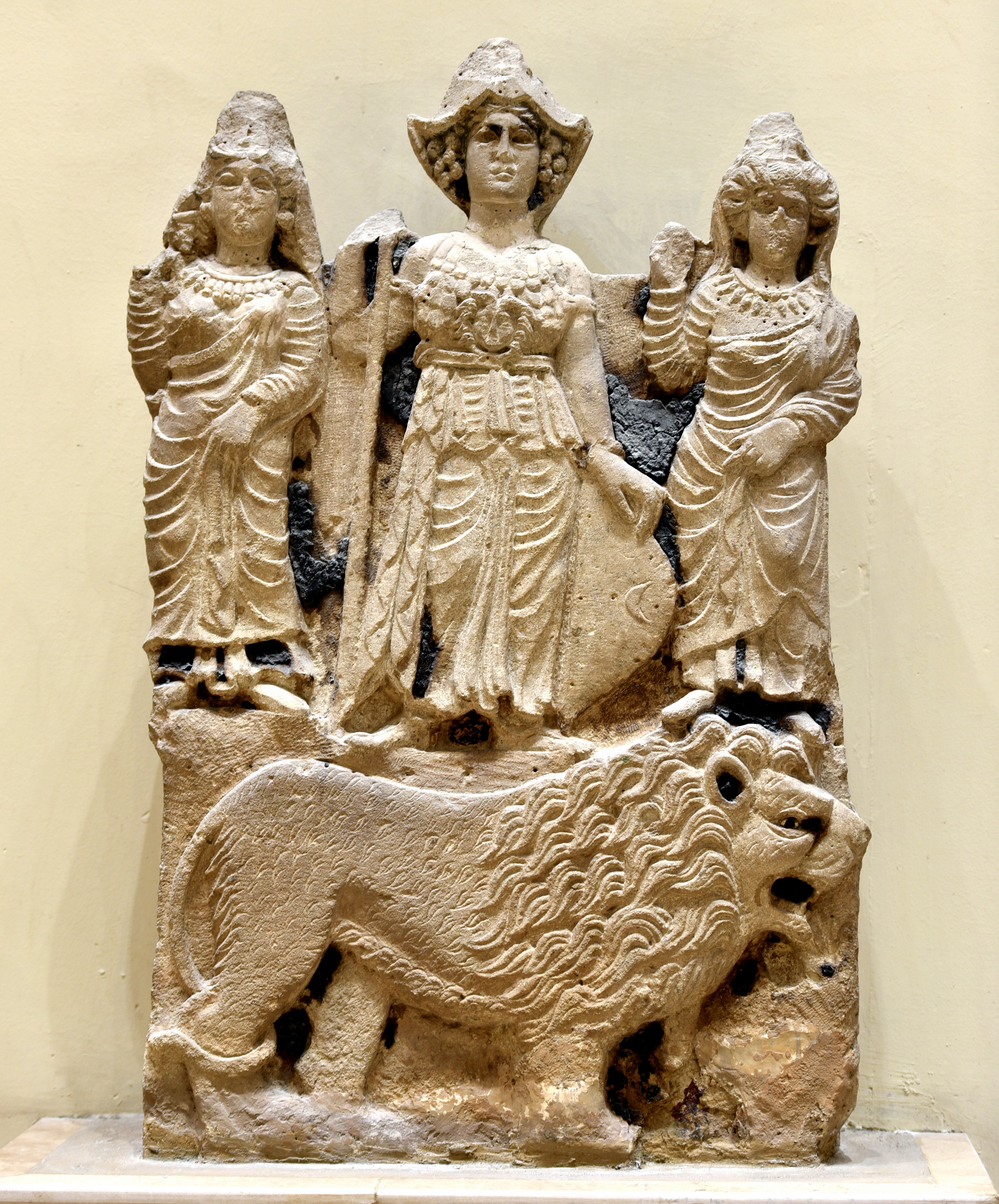 This carved scene in relief depicts 3 women above a standing and roaring lion. In the middle Al-Lat (also Allat, Allatu, and Alilat) wears a wonderful military attire and head cap (similar to Athena). Her right arm holds a long spear while the left hand holds a shield. Medusa appears on her chest. Al-Lat stands on both feet. She is flanked by two smaller female figures; both of them raise their right hand in salutation while their left hands grasp and lift up an elegant garment. They also stand on their left foot while their right foot is a little bit relaxed, unlike Al-Lat. It is unknown whether these females represent worshippers or the goddesses Manat and al-Uzza. From the 5th temple at Hatra, Ninawa Governorate, Iraq. Parthian period, 1st to 3rd century CE. On display at the Iraq Museum in Baghdad, Republic of Iraq.