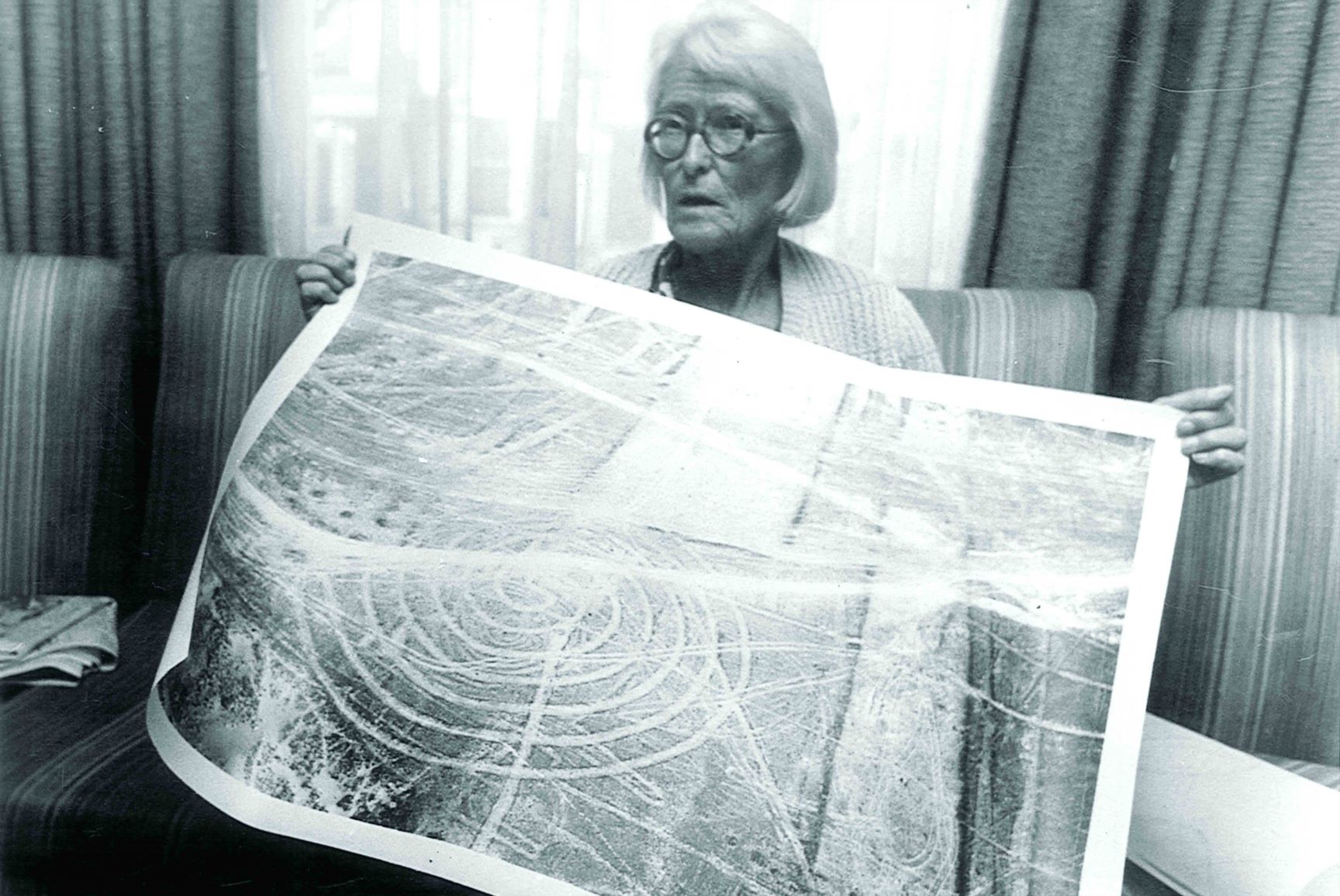 Maria Reiche with a large aerial photo of Nazca Lines. She was a German-born Peruvian mathematician and archaeologist best known for her research into the Nazca Lines. Date of photograph is unknown. Image credit: The Maria Reiche Foundation.
