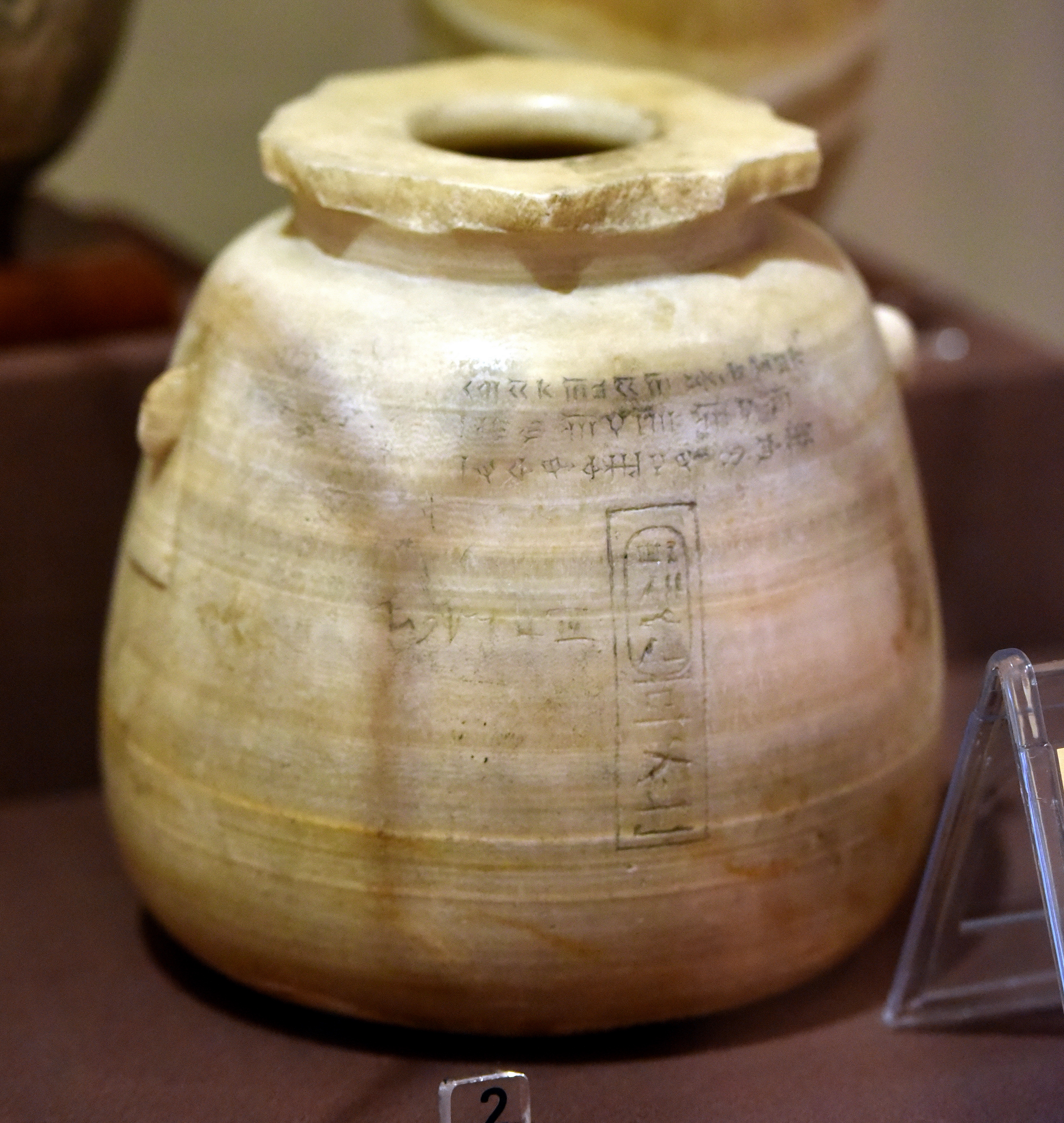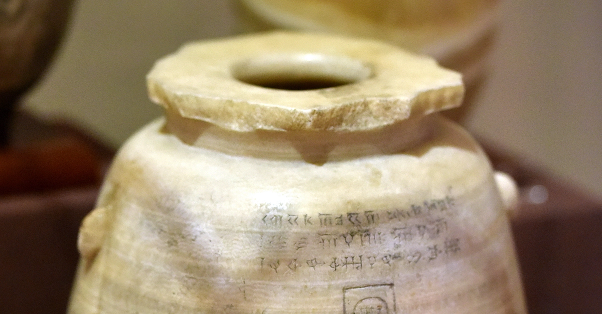 This alabaster jar is inscribed with Elamite, Old Persian, and Neo-Babylonian cuneiforms. A cartouche of the Achaemenid king Xerxes I also appears. From Nimrud, in modern-day Ninawa Governorate, Iraq. Regin of Xerxes I, 486–465 BCE. On display at the Iraq Museum in Baghdad, Republic of Iraq.