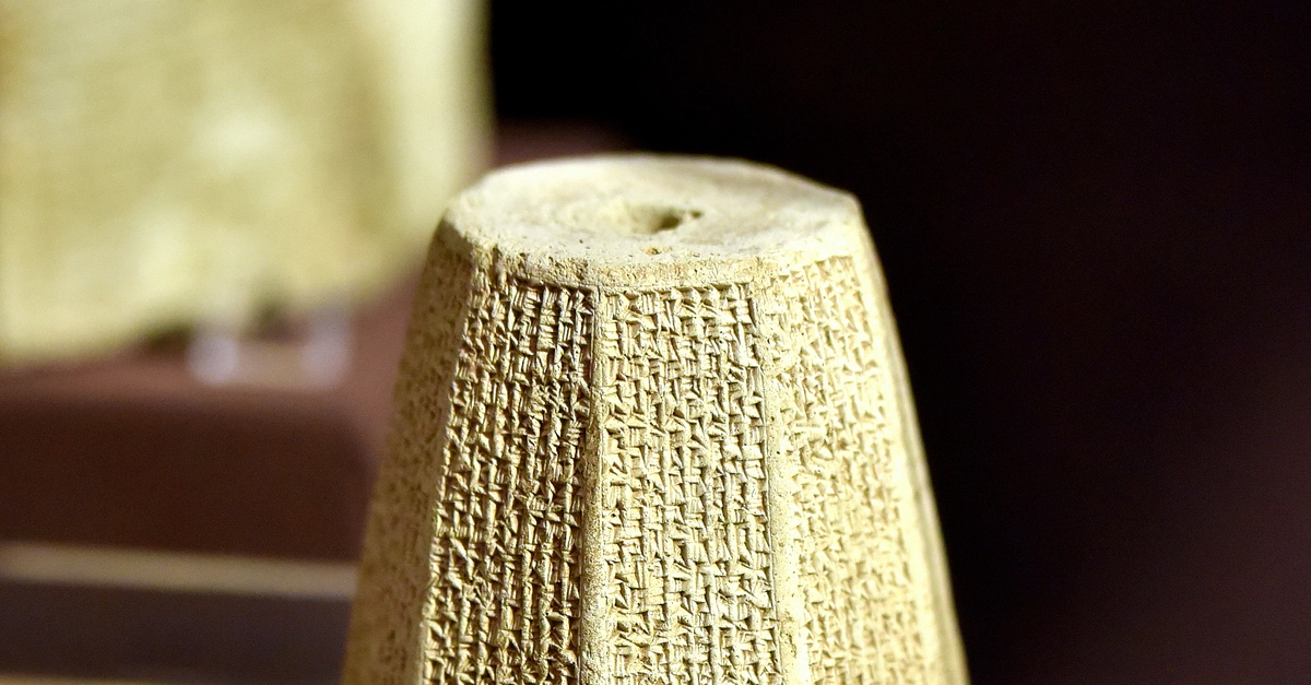 The cuneiform inscription on this octagonal spindle-shaped clay prism narrates the military campaigns of the Neo-Assyrian king Sargon II (reigned 722 - 705 BCE). Neo-Assyrian period, late 8th century BCE. From Nineveh, in modern-day Ninawa Governorate, Iraq. On display at the Iraq Museum in Baghdad, Republic of Iraq.