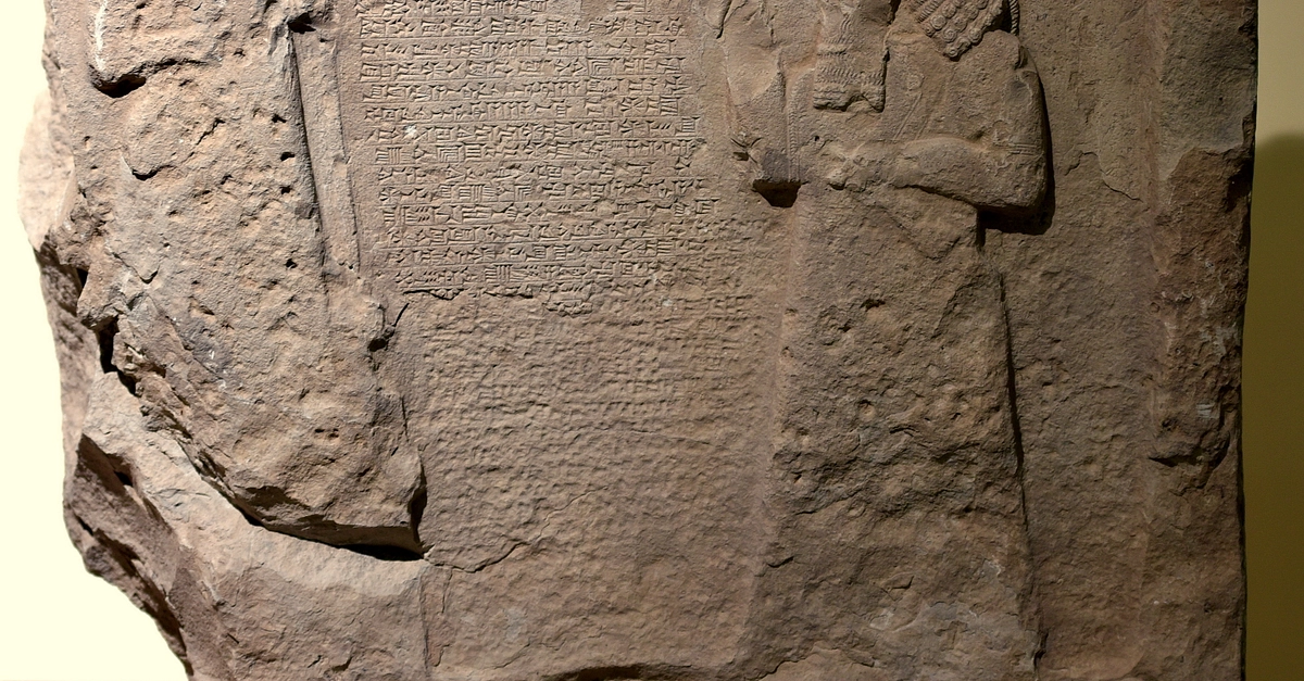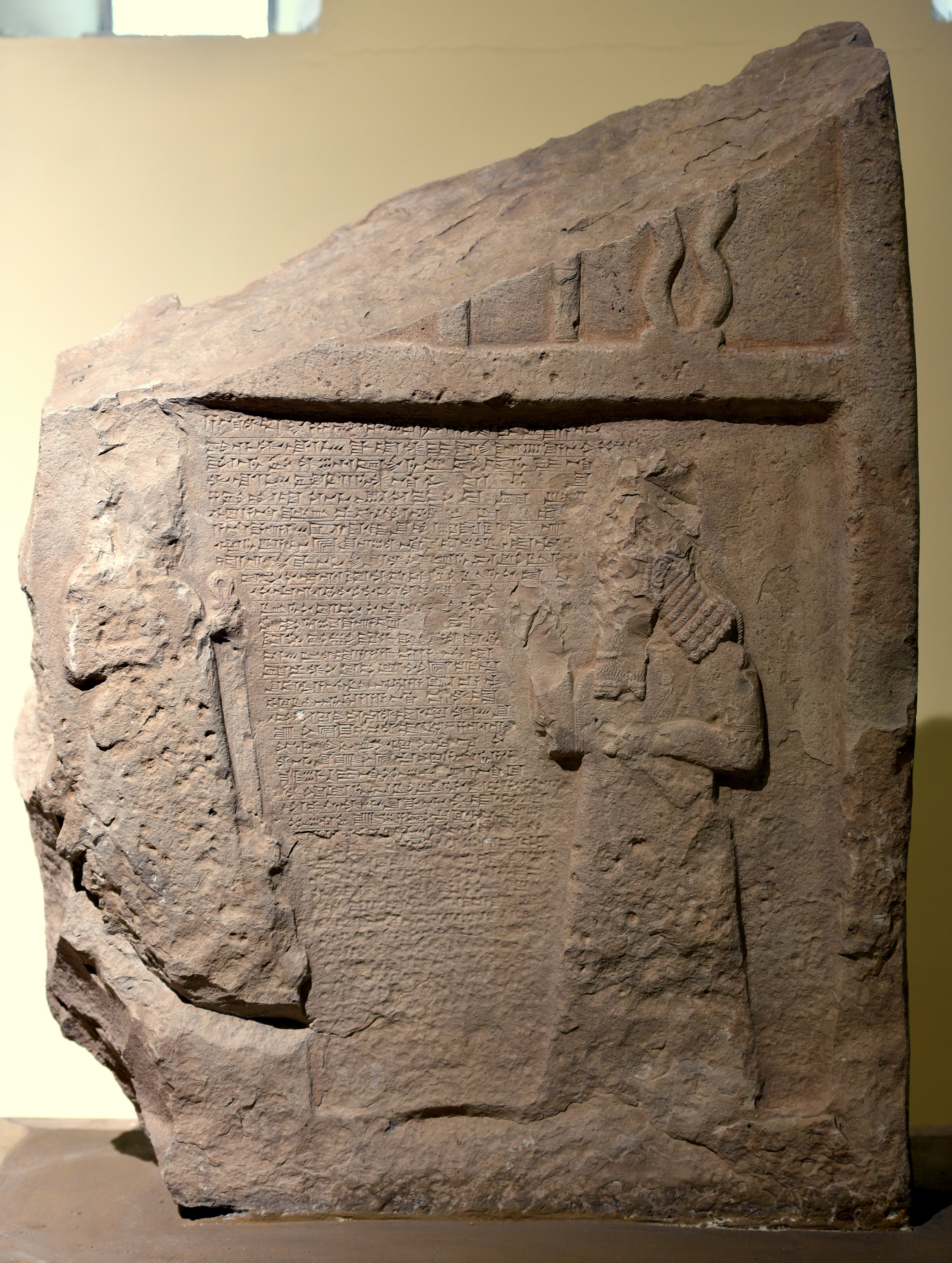 Only this fragment of a large stele has survived. On the surface, the Assyrian and Babylonian kings were carved in relief. The cuneiform inscription narrates a political treaty between them. The faces of the kings were deliberately vandalized. Neo-Assyrian period, 911-612 BCE. From A'na (Anat) District, al-Anbar Governorate, Iraq. On display at the Iraq Museum in Baghdad, Republic of Iraq.
