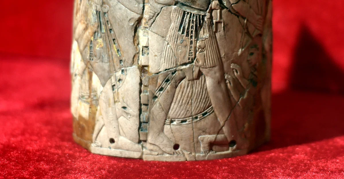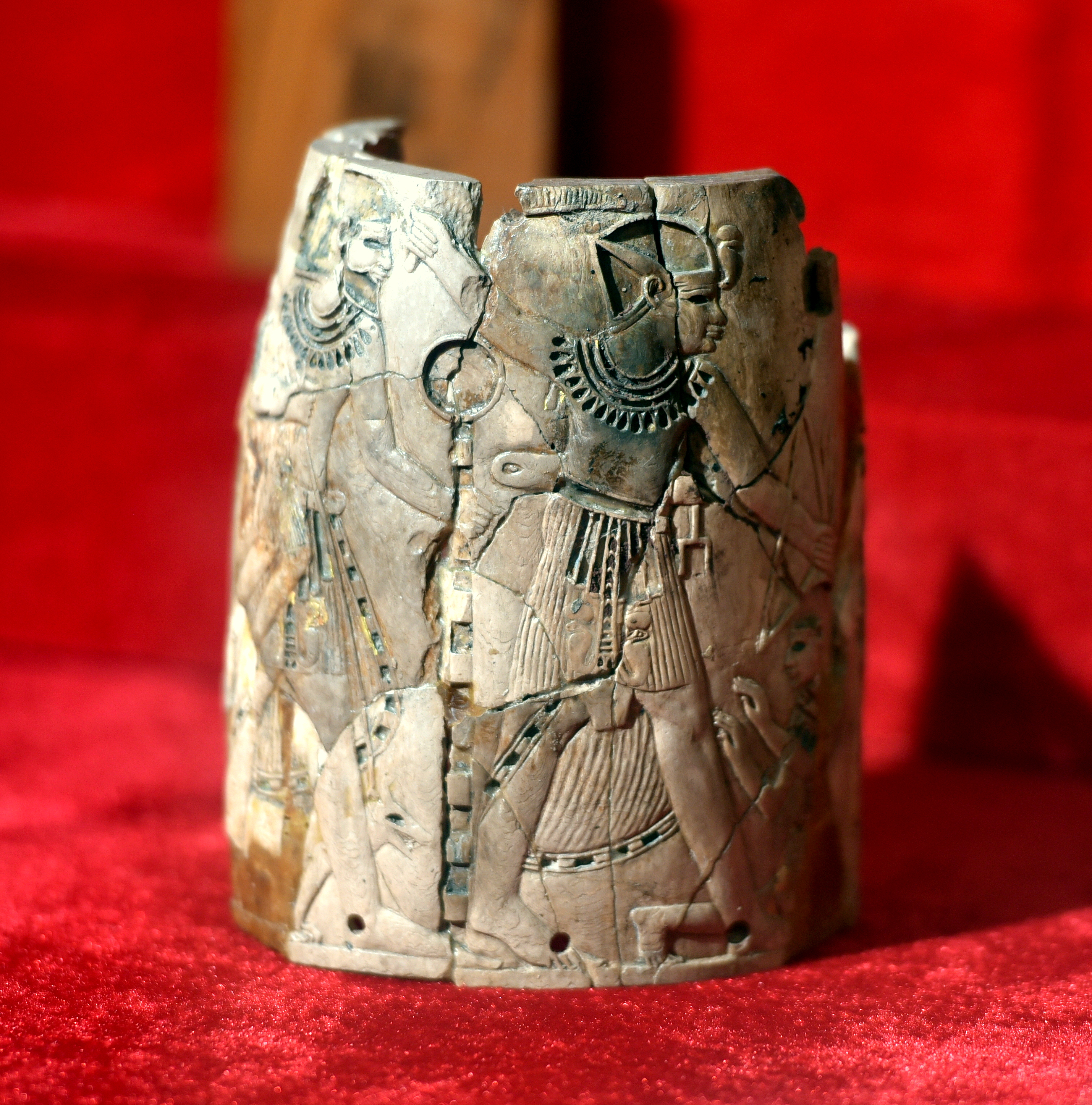 This cylinder was fragmented into two or three main parts when it was found, although it was carved from one large tusk. The scene depicts an unidentified Egyptian pharaoh wearing the blue crown (khepresh; with a uraeus at the front) of Egypt and an inlaid "usekh" collar. His right hand is raised behind him holding a feather while the left arm grasps a bow and three arrows on the head of a kneeling boy. Behind the Pharaoh, a man stands, holding a staff in his left hand. This art is part of the "Classical Phoenician style-group". Part of the Nimrud ivories; excavated by the State Board of Antiquities in Iraq in 1975 CE. Neo-Assyrian period, 9th to 7th century BCE. From Well AJ at the North-West Palace, Nimrud, Iraq. On display at the Iraq Museum in Baghdad, Republic of Iraq.