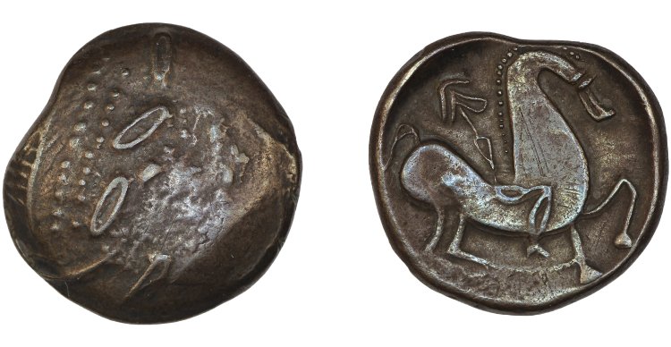 The reverse depicts a horse and helmeted rider while the obverse depicts the head of Zeus, it is one of many imitations of Greek currency to be minted in Celtic Europe in ancient times. The figures on these coins became increasingly abstracted as they grew more distant from their original inspirations and were influenced by local art.