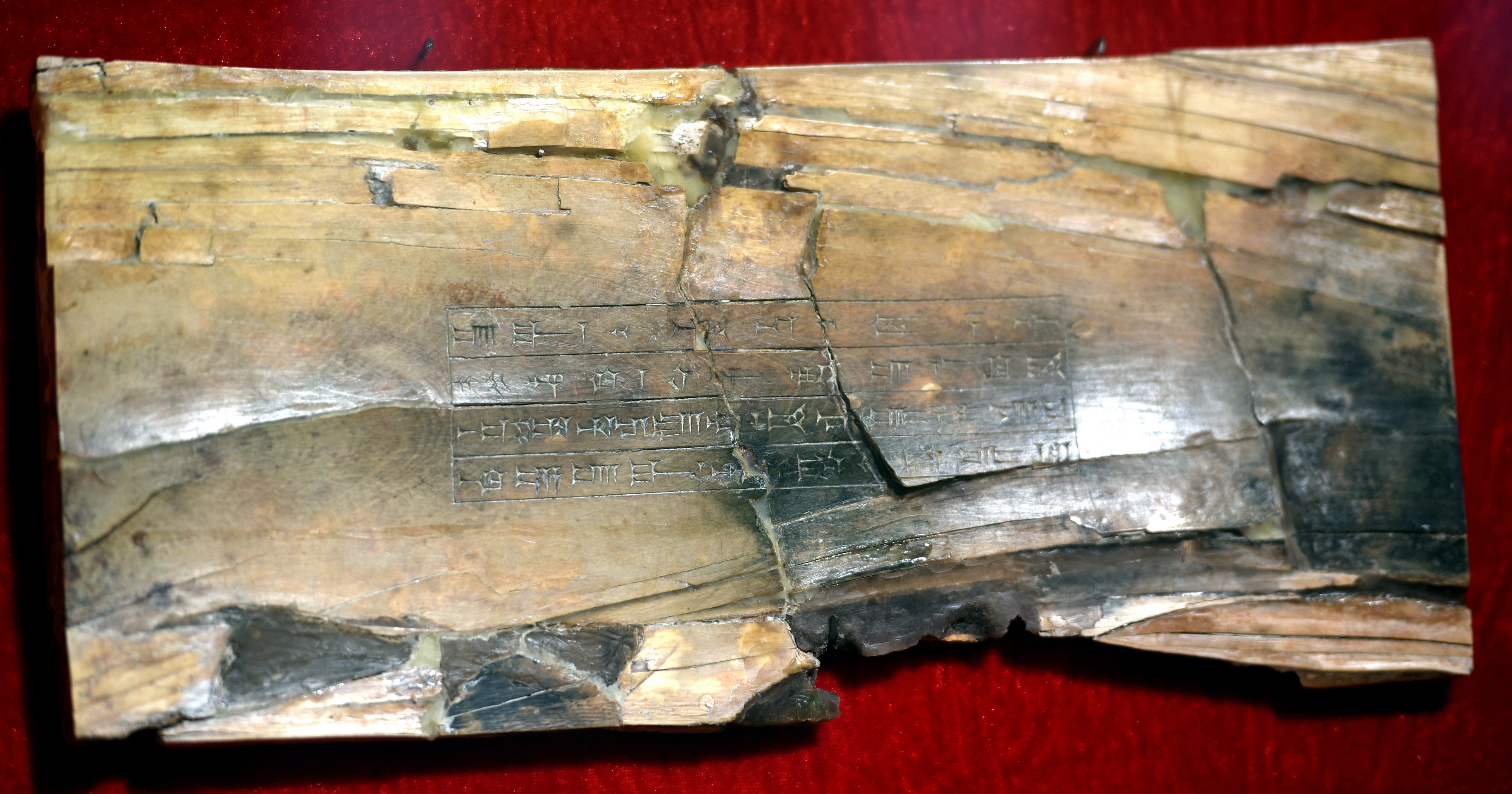 This is the outer cover of the ivory writing-boards (6 in number) incised with four lines of Assyrian cuneiform text, giving the title of the astrological script which was a compilation of omens ordered by Neo-Assyrian king Sargon II (reigned 722-705 BC) to be set up in his palace at Khorsabad. The surface still harbors traces of beeswax; this is the earliest known specimen from Western Asia of writing upon wax. The text reads"'Palace of Sargon, King of the world, King of Assyria. He caused [the text beginning with the words] Enuma Anu Enlil to be inscribed on an ivory tablet and set it in his palace of Dur-Sharrukin". Found inside Well AB at the North-West Palace of Ashurnasirpal II, Nimrud, Iraq, by the British School of Archaeology in Iraq led by Sir M. Mallowan (1904 - 1978 CE); Well AB was previously discovered by Sir H. Layard (1817 - 1894 CE) in 1851 CE and rediscovered by Sir Max Mallowan in March 1953 CE. Late 8th century BCE. On display at the Iraq Museum in Baghdad, Republic of Iraq.