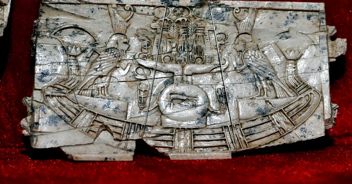 Ivory panel with an Egyptian religious scene. On a sacred barge with papyrus prows, a crowned sun disc (with two cobras) rides and appears to arise from the horizon. It is flanked by two Ba birds. On the disc, there is the so-called triple (hmhm) atef crown, flanked by uraei set on a pair of ram's horns. The wedjat eye, looking to the left, is at the center of the disc. The Ba birds are human-headed, have human arms, and wear the double crown of Egypt and the nemes head cloth. The overall design is reminiscent of a very complex 'theological' jewelry, such as that from the tomb of Tutankhamun.