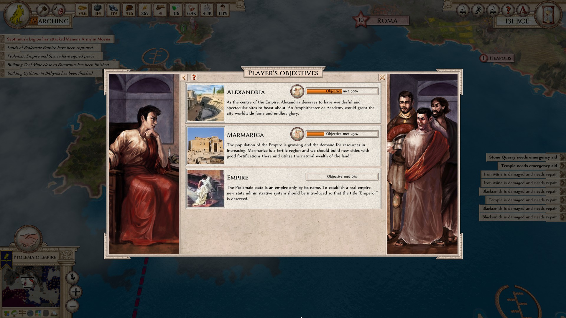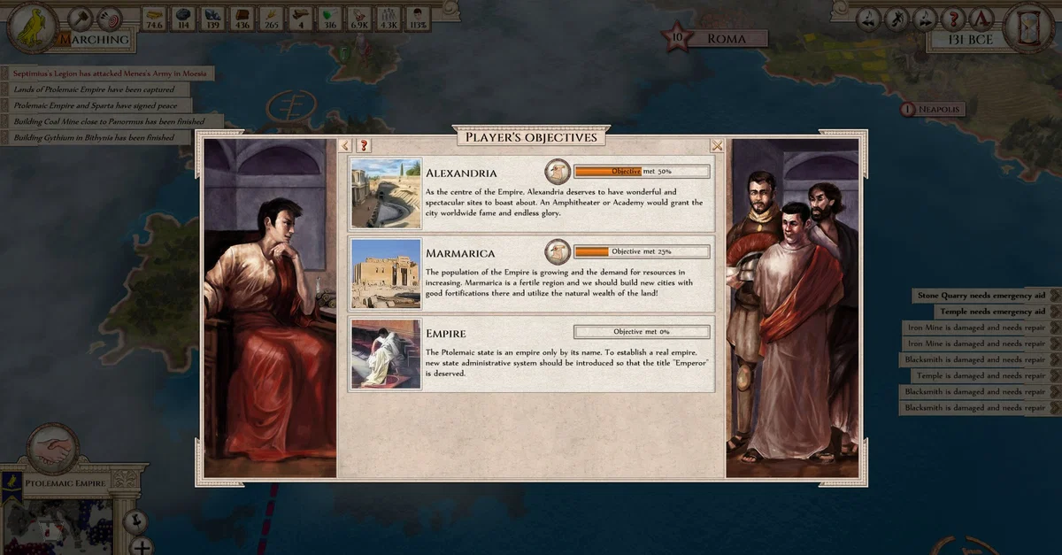 Screenshot from the game Aggressors: Ancient Rome showing player objectives.