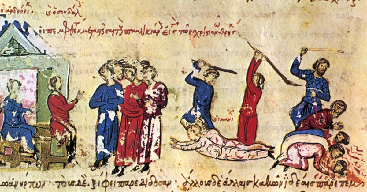 The massacre of the Paulicians in 843/844 CE. Chronicle of John Skylitzes, cod. Vitr. 26-2, fol. 69, Madrid National Library