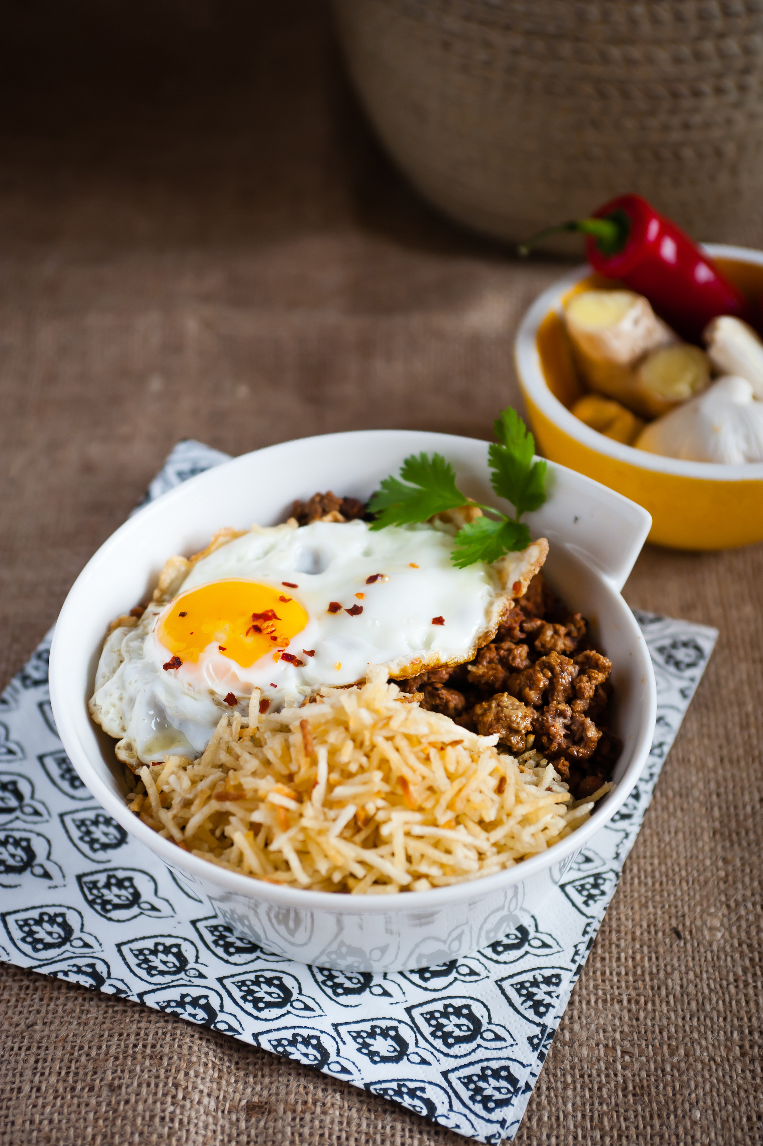 Parsi Dish: Kheema per edu nay sali: Ground meat with egg and matchstick Pptatoes