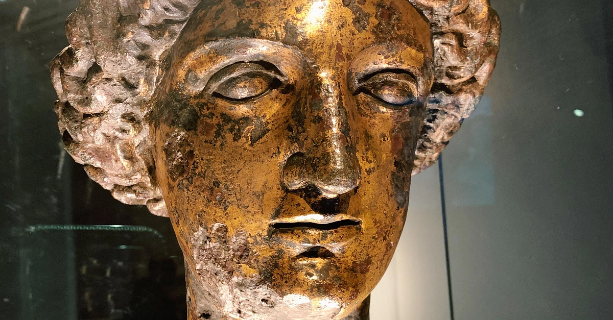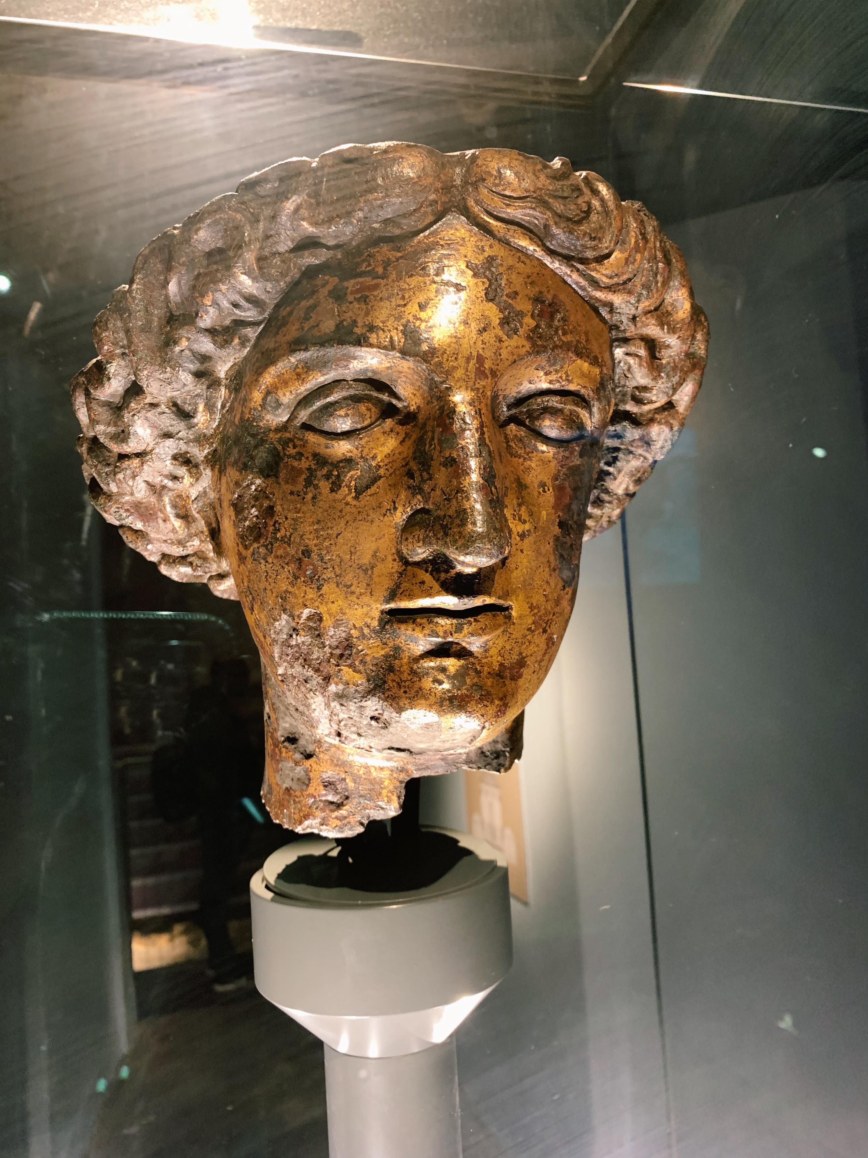 Head from the guilded bronze statue of the goddess Sulis Minerva. The statue would have been standing in the temple dedicated to the goddess in Aquae Sulis (now Bath) in the Roman period (1st - early 5th century CE). Now on display in The Roman Baths Museum in Bath, UK.