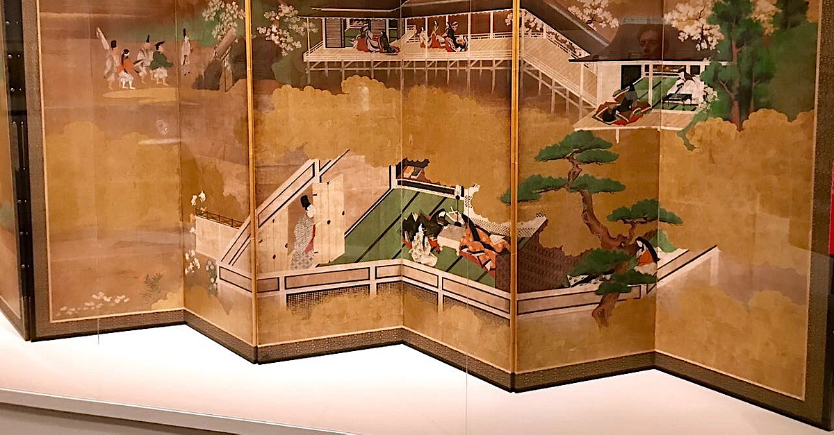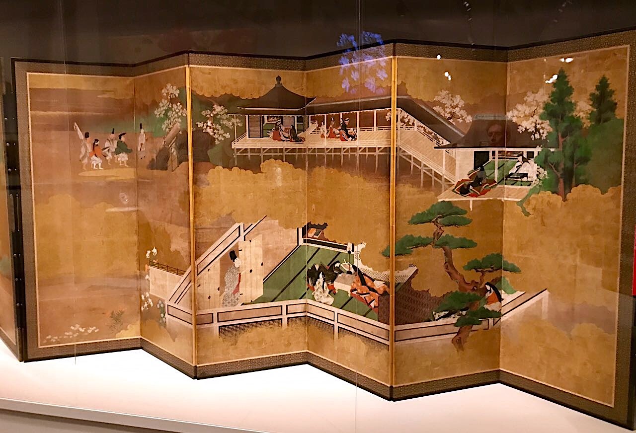 A Japanese folding screen or byobu, used to sperate room space in traditional homes. This example shows a scene from the Tale of Genji. H. 153.4 cm x W. 349.9 cm. 18th century CE. (Asian Art Museum, San Francisco)