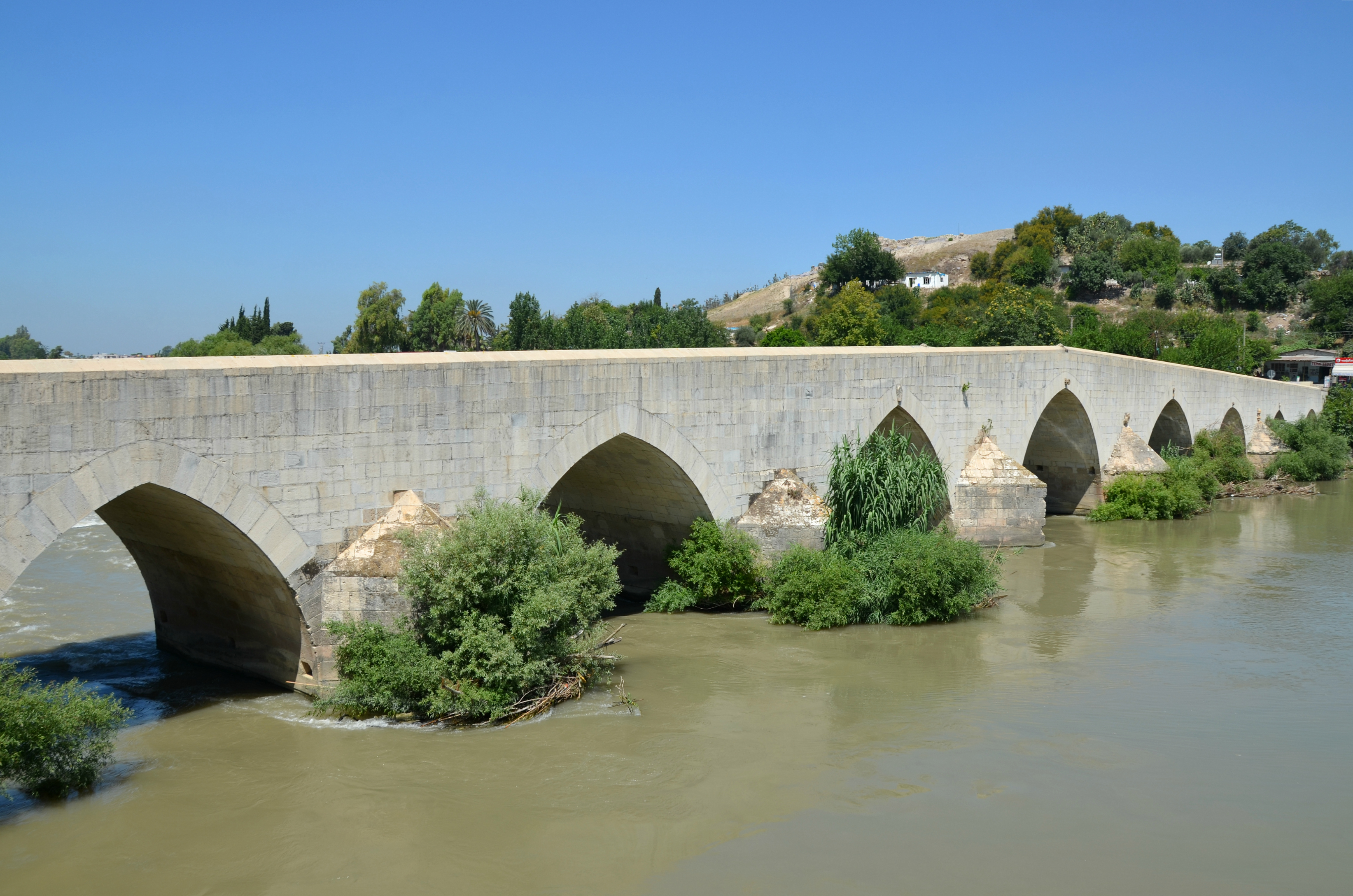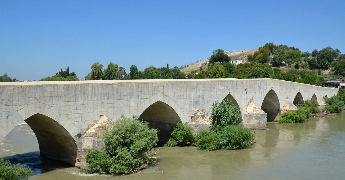 Roman bridge over the river Pyramus, built during the reign of Constantius II. It was restored by Justinian I in the 6th century CE and renovated in 743 and 840 CE. Mopsuestia, Turkey