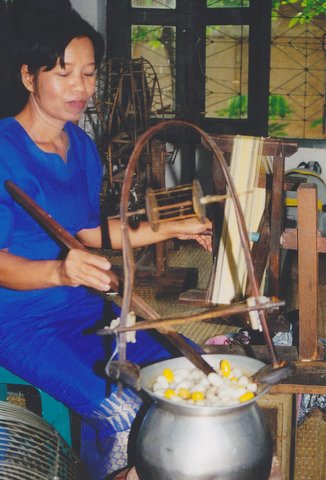 A woman from Thailand boils the cocoons of the silkworm in the initial phase of making silk. Photo taken March 2012.