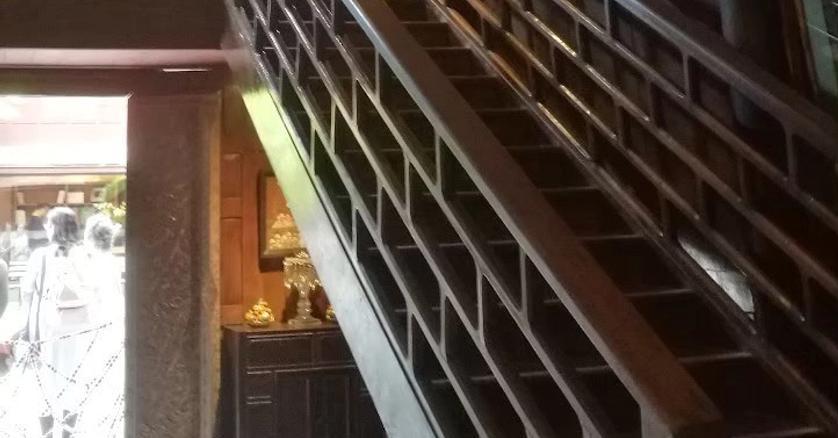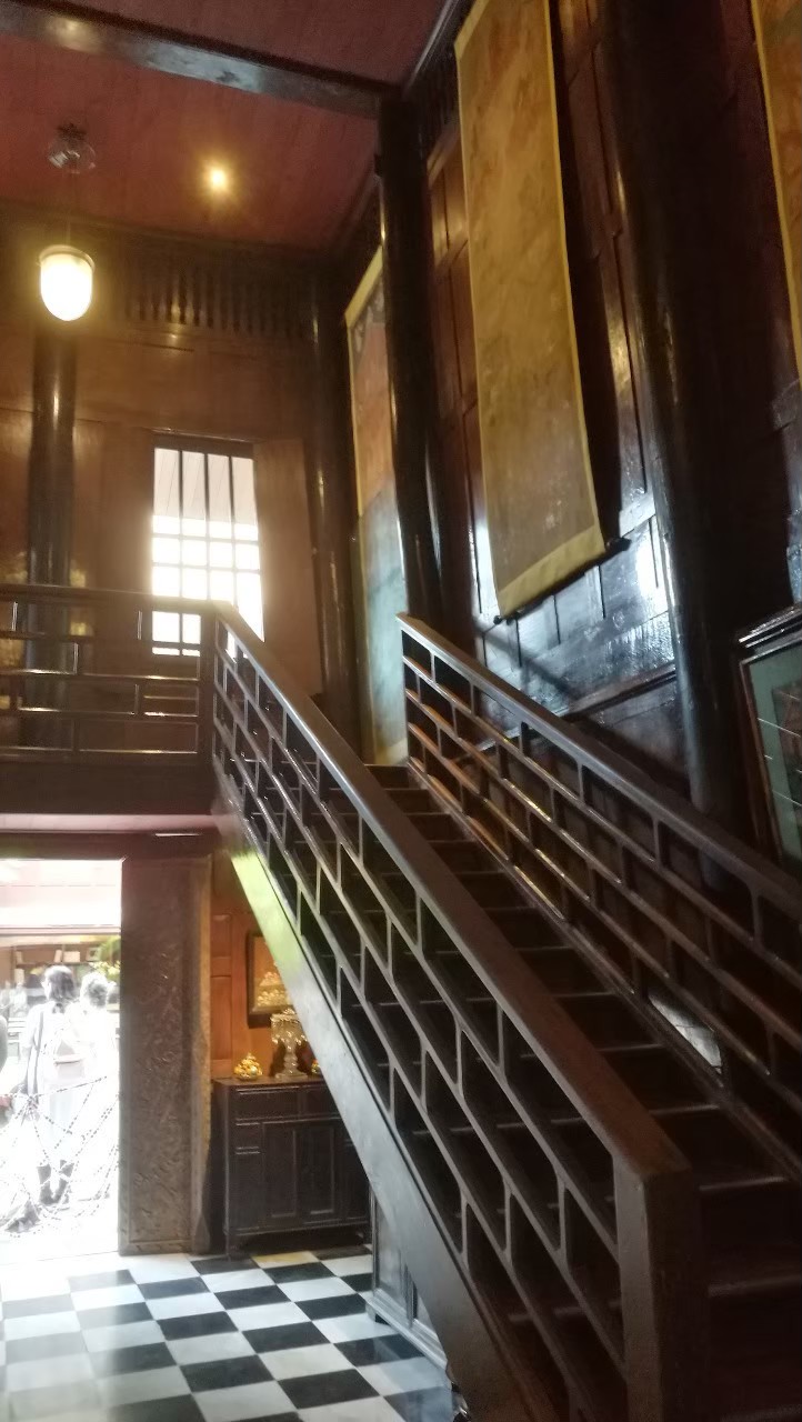 Internal teak staircase and Italian marble black and white tiles at the Jim Thompson House Museum in Bangkok, Thailand. The house was built in c. 1959 CE and incorporated six traditional teak houses that were brought down the canals or khlongs to the Jim Thompson House from the ruins of Ayutthaya (c. 1351 - 1757 CE) - the second Siamese capital. The photo was taken July 2019 CE.