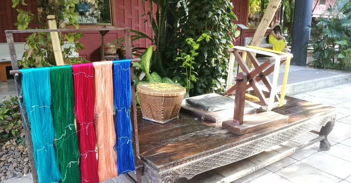 Silk strands on display at the Jim Thompson House Museum in Bangkok, Thailand. This photo was taken in July 2019 CE.