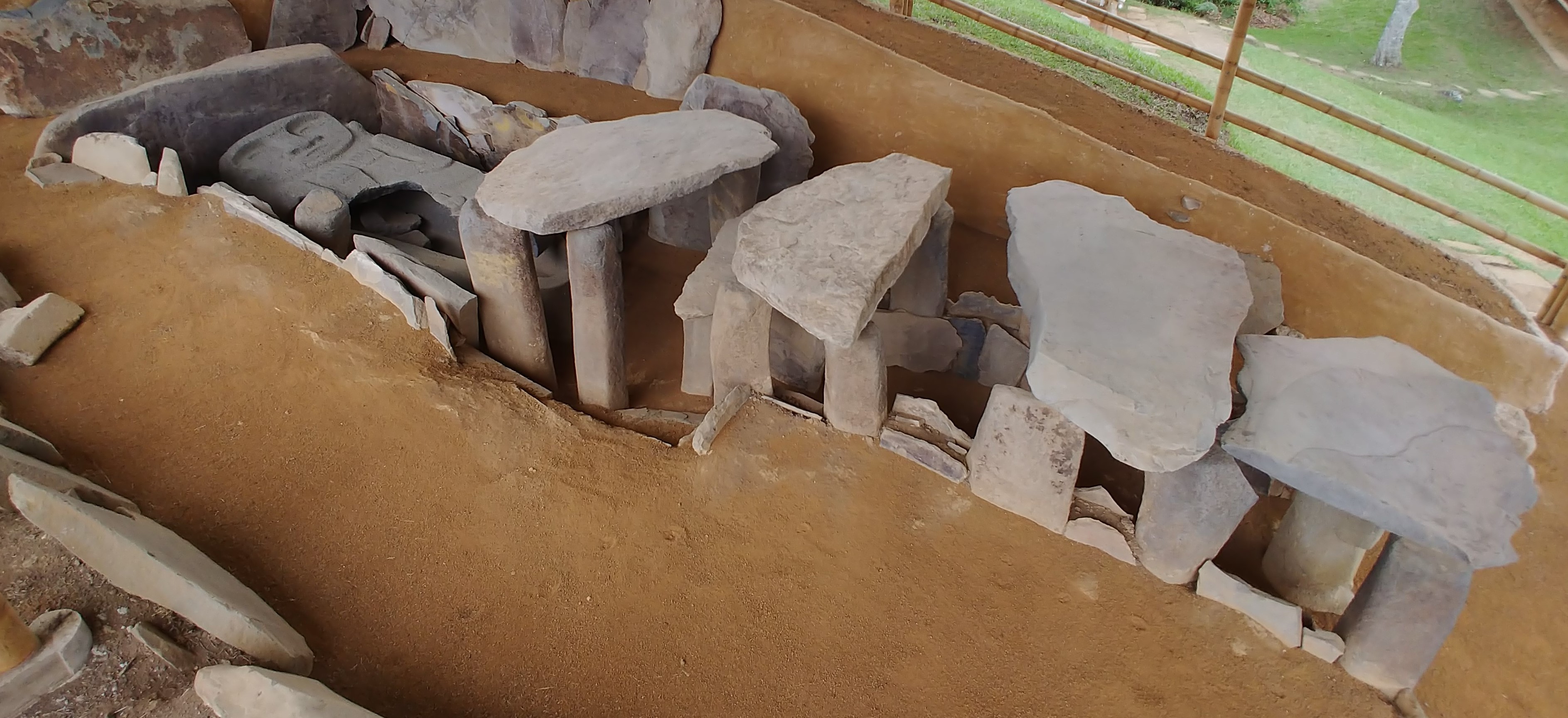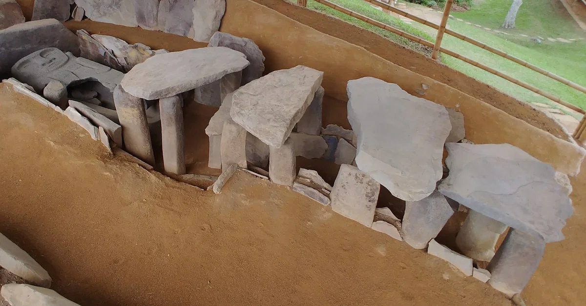 Stone slab tomb with carved sarcophagus lid at Meseta A at Alto de los Ídolos near San Agustín, Huila Department, Colombia. Created c. 1st to 10th century CE.