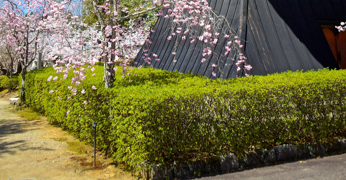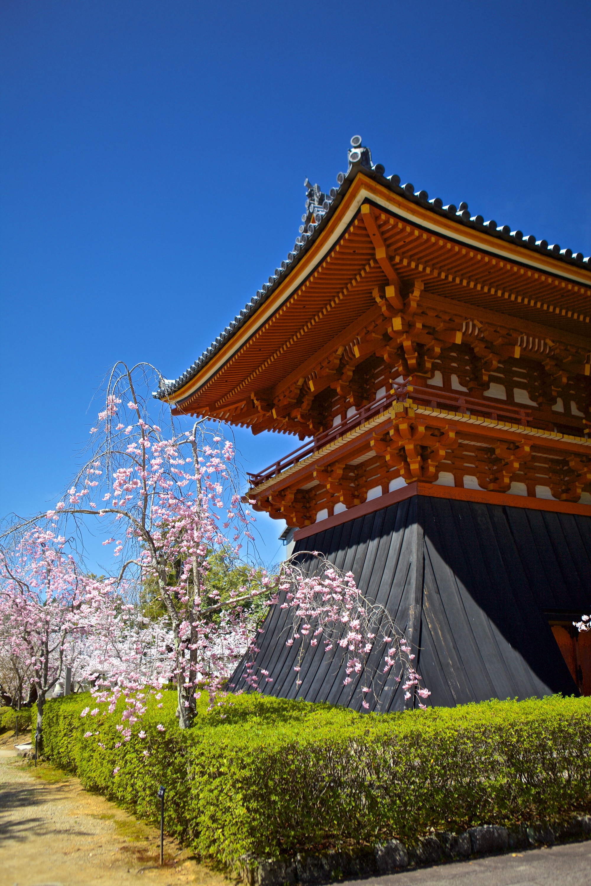The bell tower and cherry blossoms of the Buddhist temple site of Ninna-ji, Kyoto, Japan. The temple was founded in 888 CE.