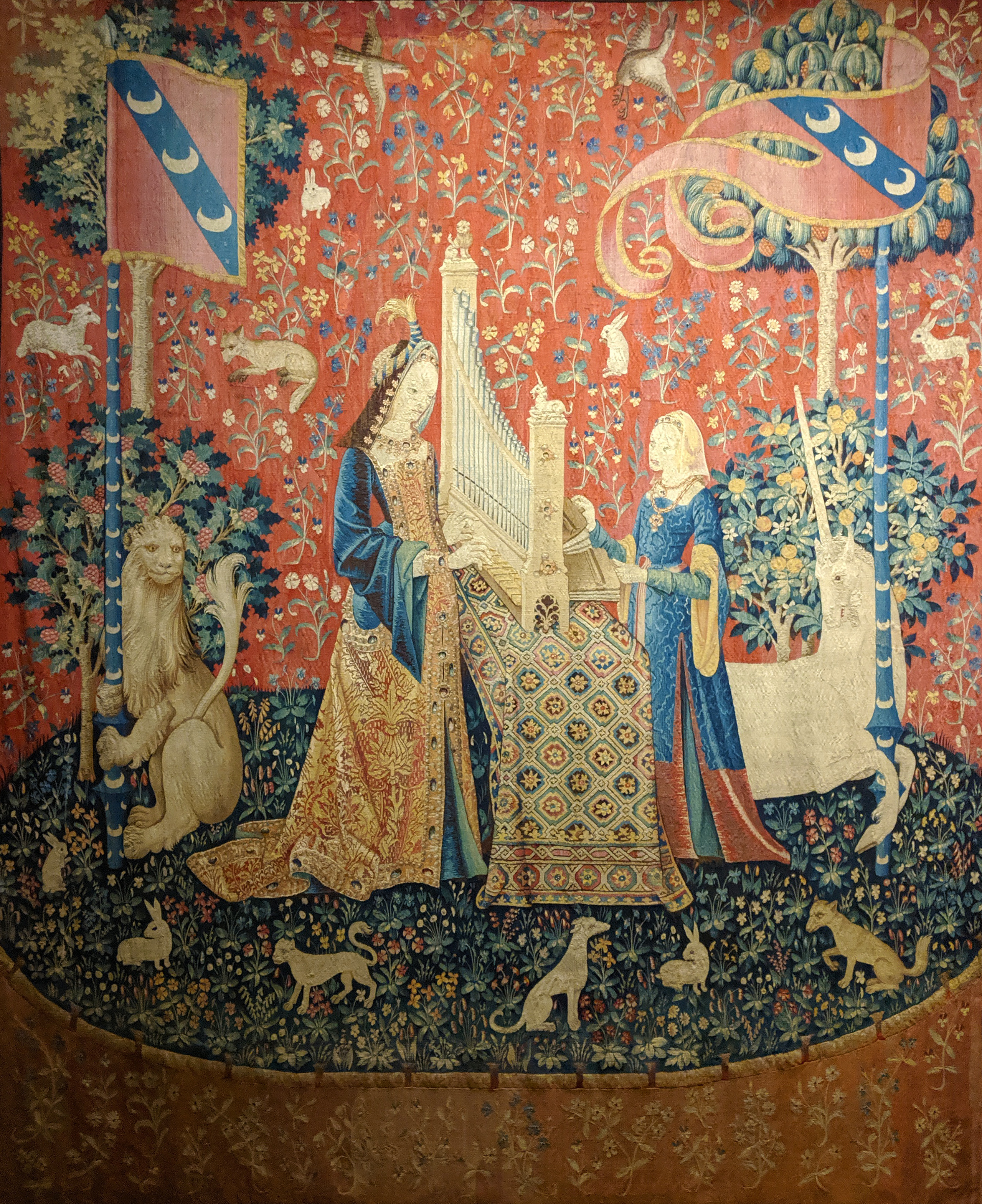 The Lady and the Unicorn are six tapestries depicting a medieval lady in various poses. Each scene depicts one of the five senses; the sixth scene is labelled À Mon Seul Désir ("to my only desire") whose meaning is unclear. Historians attribute the tapestries to be commissioned by the Le Viste family due to the coat of arms prominently placed on the tapestries.