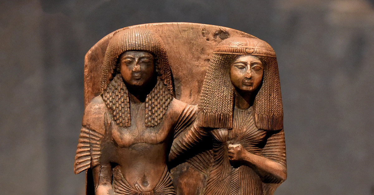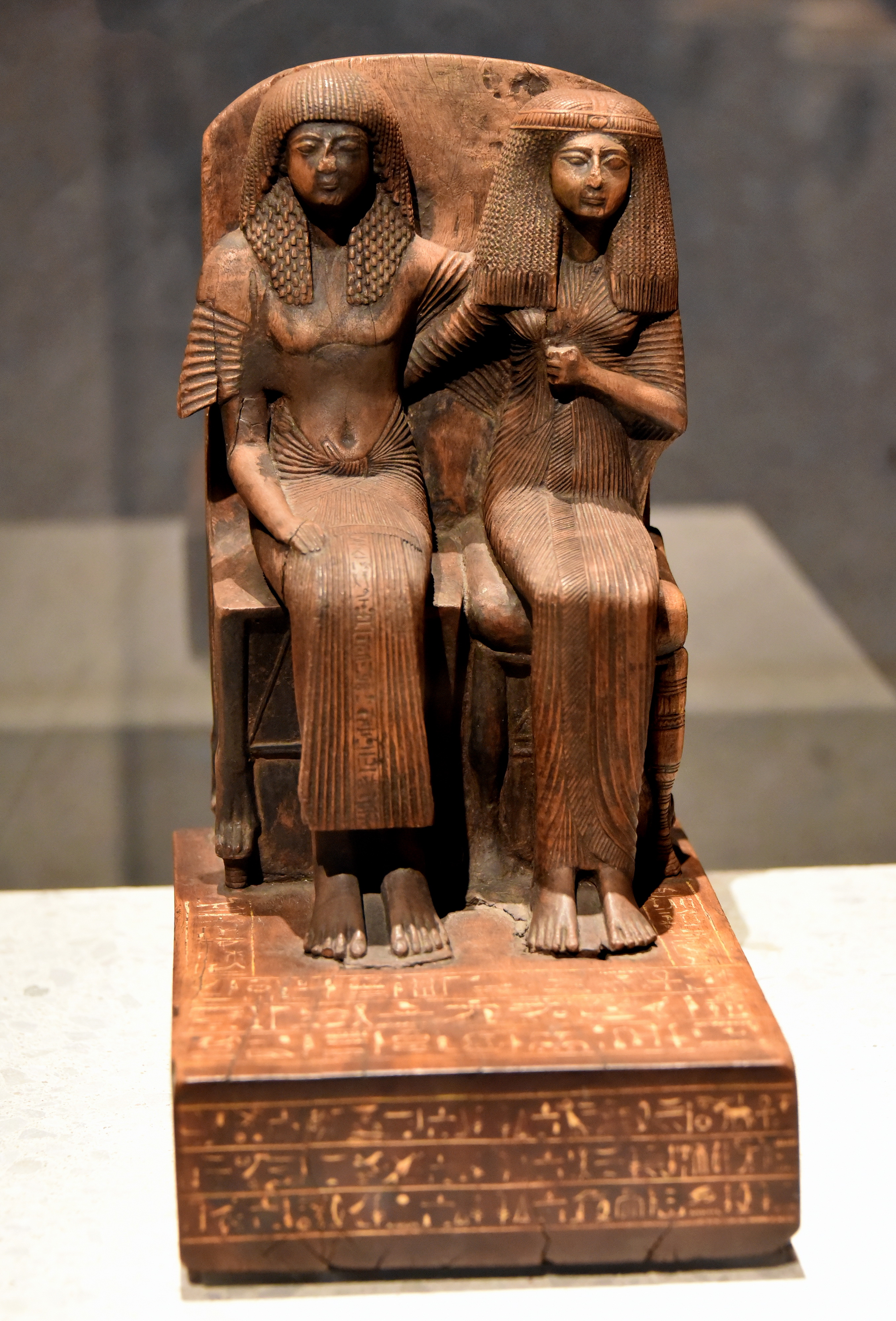 Amenemope was a royal scribe. He sits on a claw-footed chair with his wife, Hathor, who is seated on a low stool (on a pillow). They embrace each other. Painted wood. From Tomb 265 (TT265) at Deir el-Madina, Western Thebes, Egypt. New Kingdom, 19th Dynasty, reign of Seti I/Ramesses II, 1290-1213 BCE. It is on display at the Neues Museum, Berlin, Germany.