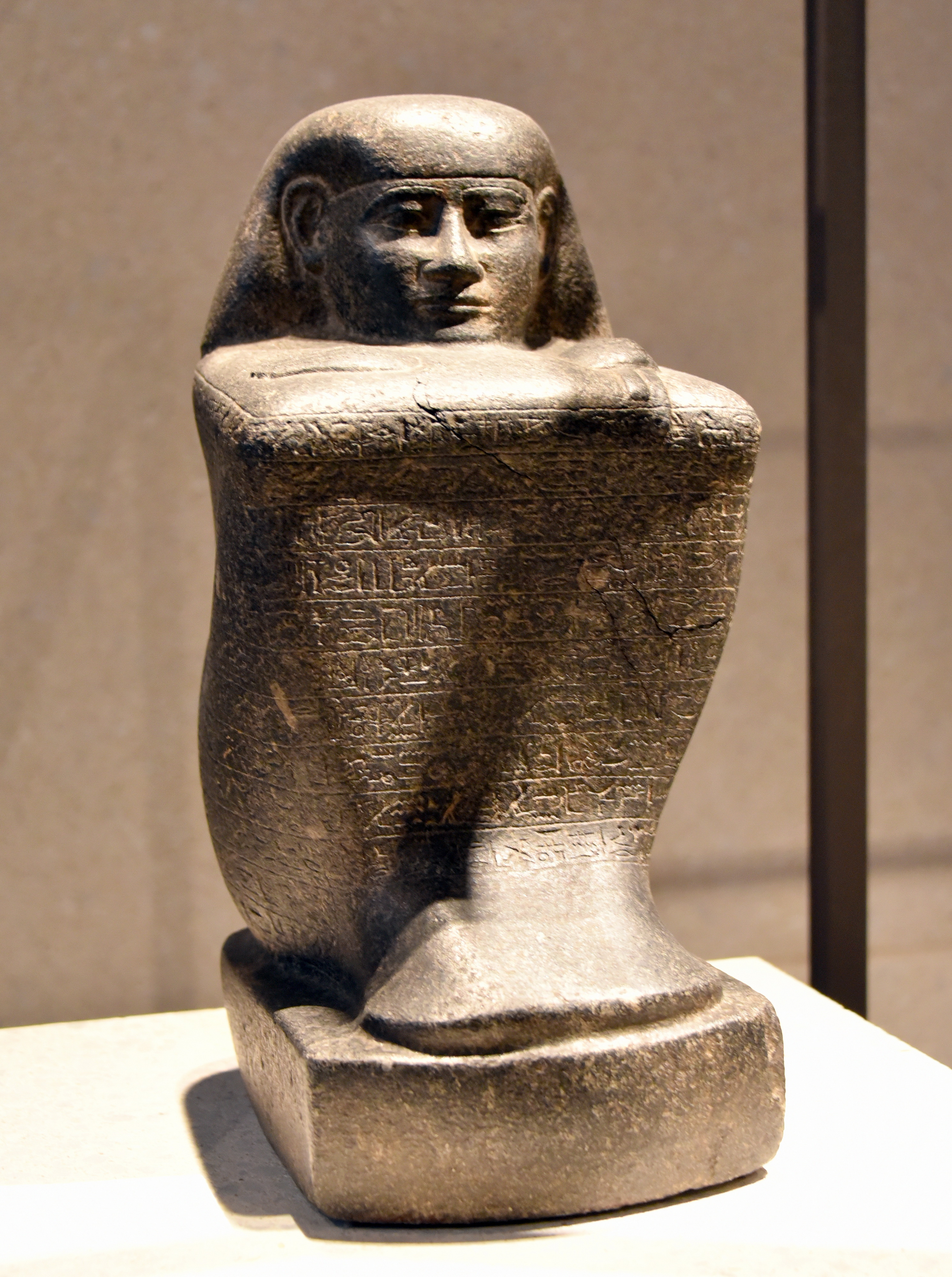 Block statue of Harwa, chief steward of the God's Wife Amenirdis. Diorite. Third Intermediate Period, 25th Dynasty (Nubian Dynasty), c. 740 BCE, From Grave 37, Western Thebes, Egypt. (The Neues Museum, Berlin, Germany).