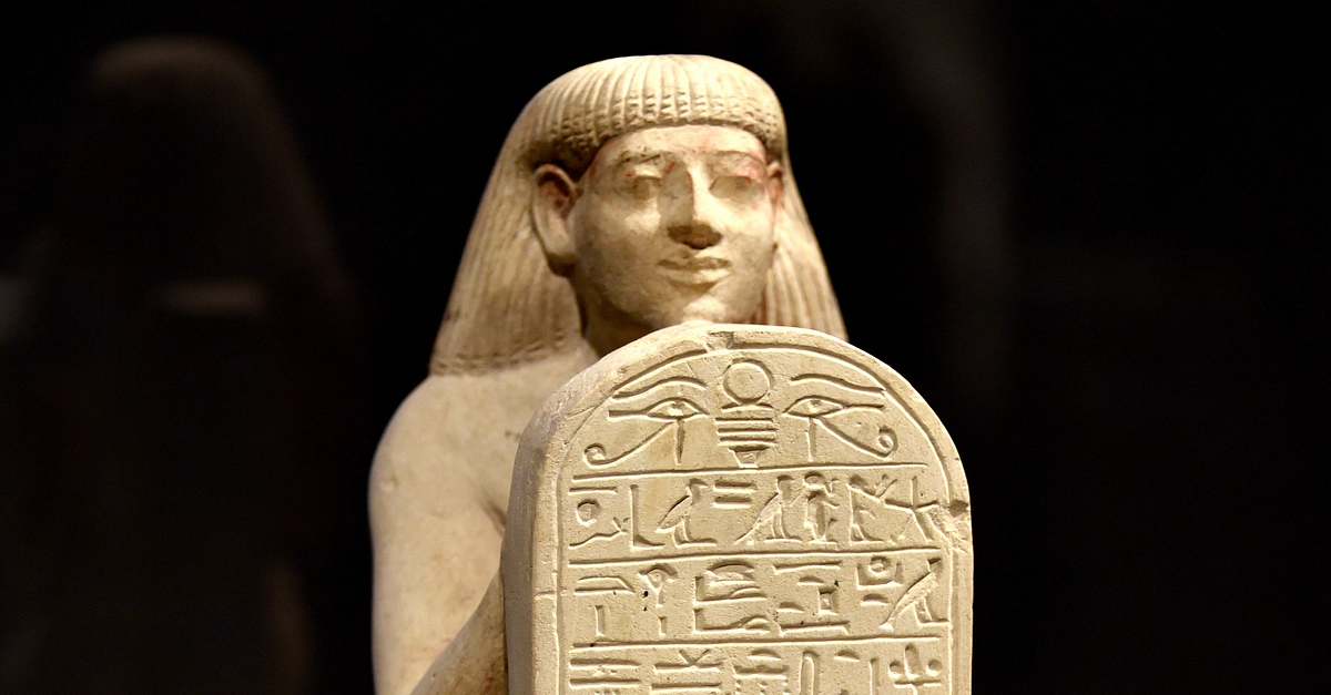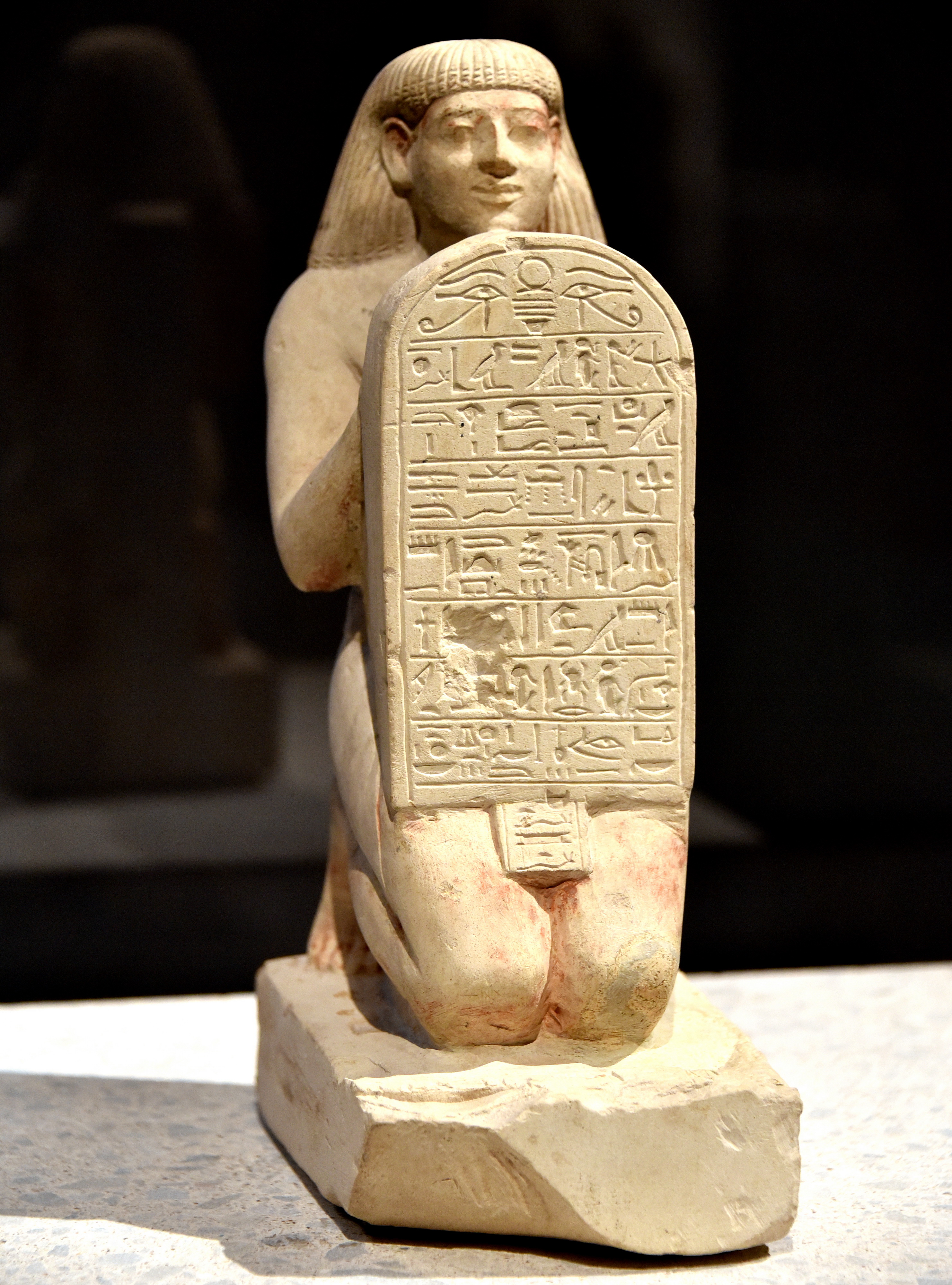 Kneeling statue of Amenemhat, holding a stela and praying to the sun. He was the scribe of the grain of Amun. Limestone. New Kingdom, 18th Dynasty, reign of Amenhotep III, 1388-1351 BCE. From Egypt, precise provenance unknown. (The Neues Museum, Berlin, Germany).