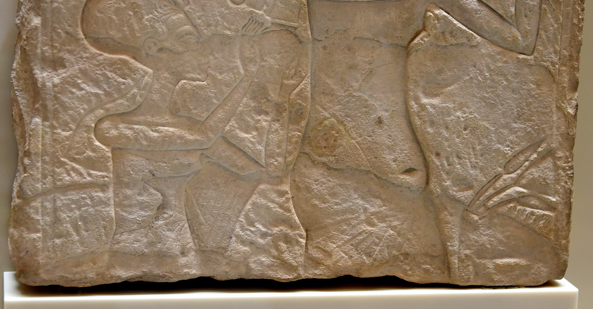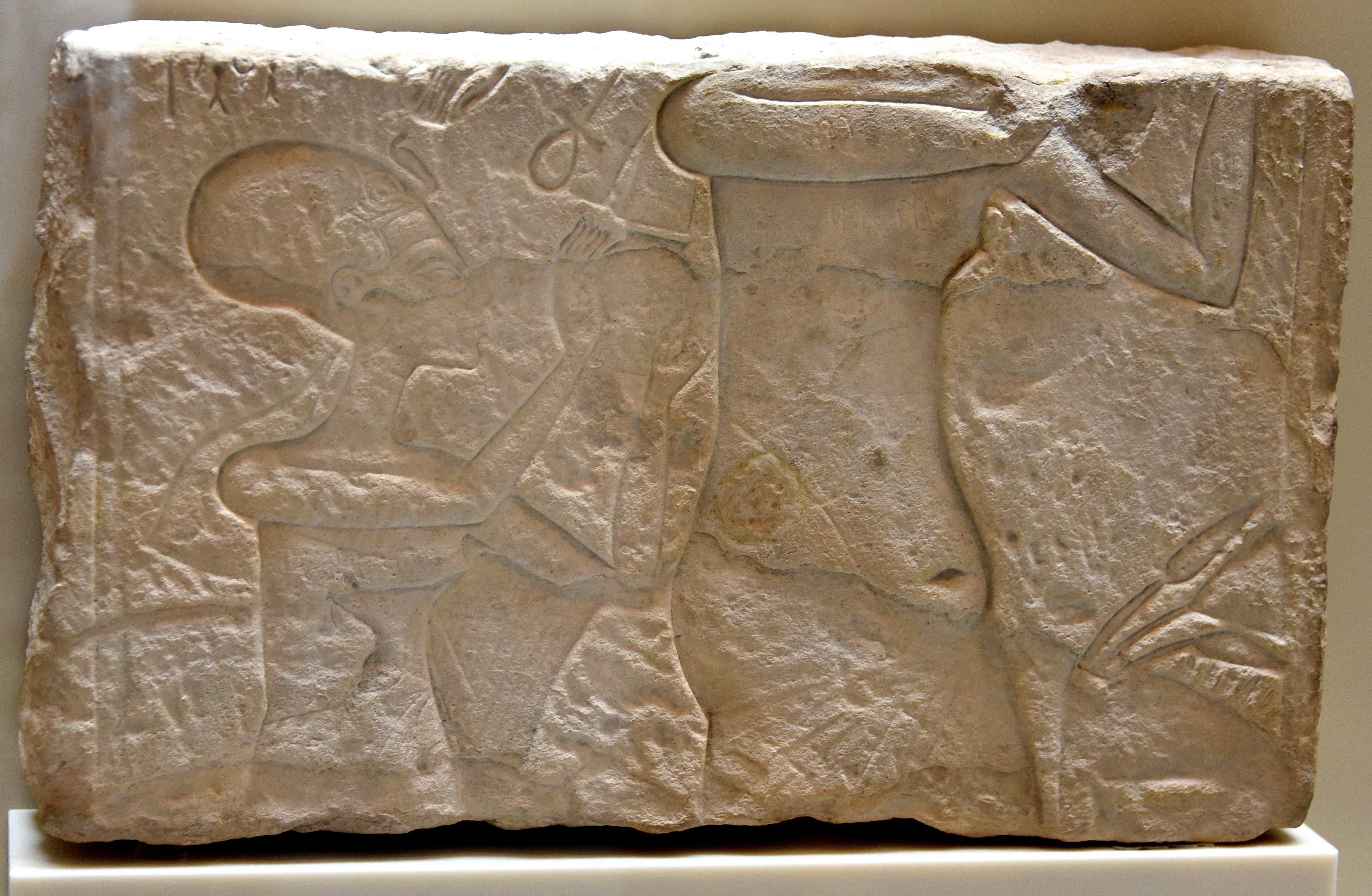On the left, queen Nefertiti (c. 1370 - c. 1336 BCE) follows her husband, Pharaoh Akhenaten(r. 1353-1336 BCE); both are worshipping Aten. Note the typical Amarna style of their depiction; her elongated head and his protuberant abdomen. Part of a temple relief. Painted limestone. Probably from Amarna, Egypt. New Kingdom, 18th Dynasty, c. 1345 BCE. It is at the Neues Museum, Berlin, Germany.