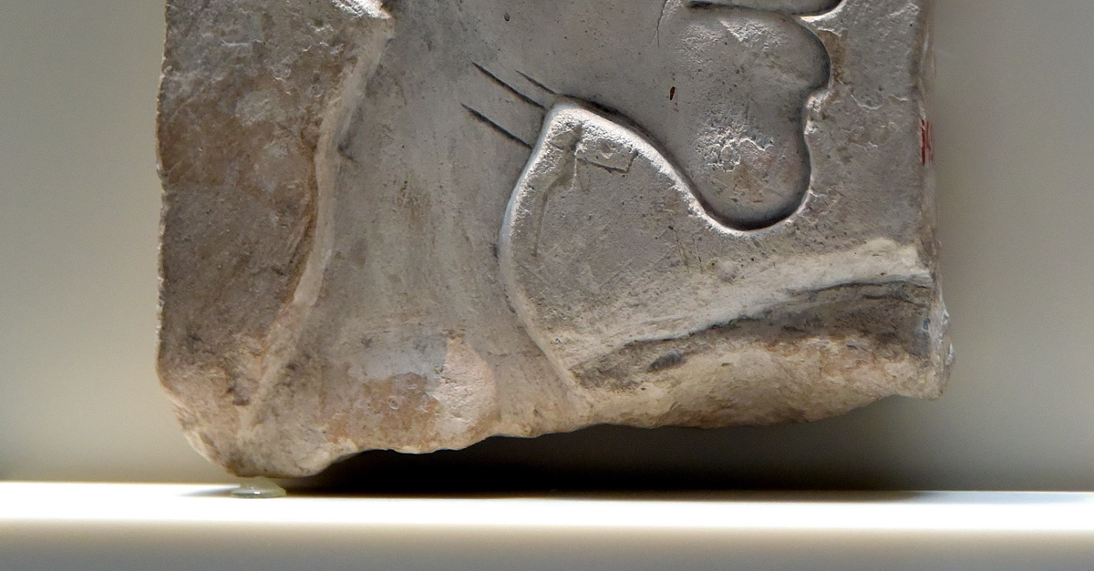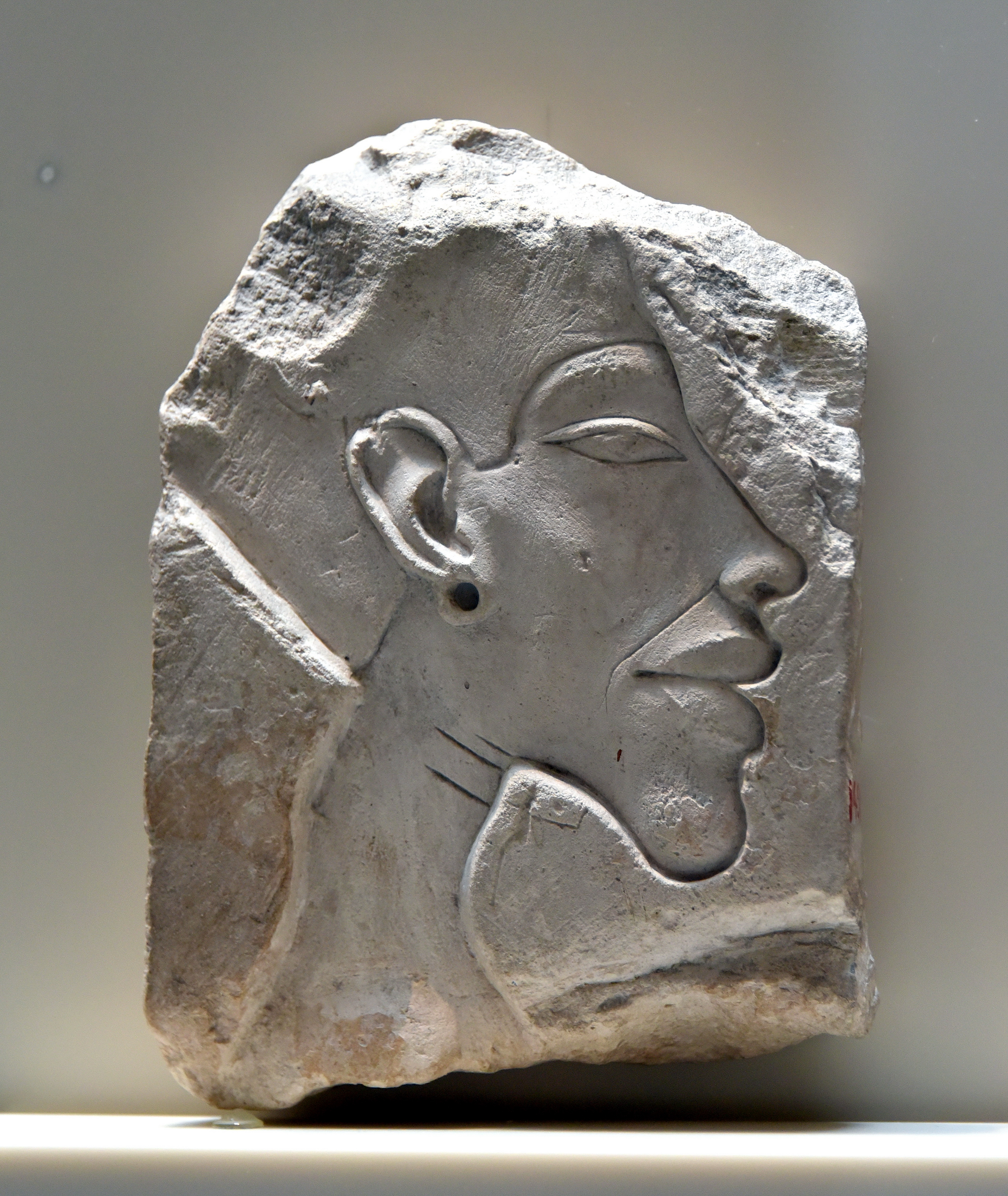 Limestone fragment showing a portrait (in Amarna style) of the Egyptian pharaoh Akhenaten (r. 1353-1336 BCE) in profile, looking to the right. Probably from Amarna, Egypt. New Kingdom, 18th Dynasty, c. 1345 BCE. It is on display at the Neues Museum, Berlin, Germany.