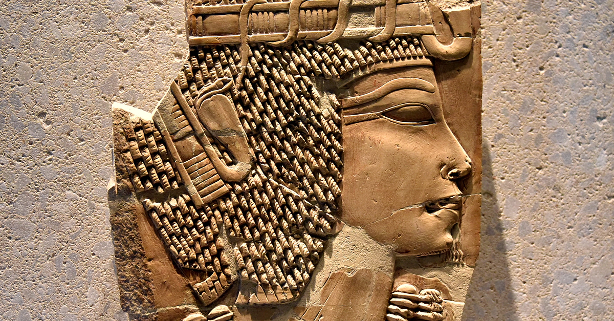 This limestone relief of the Egyptian pharaoh Amenhotep III (c. 1386-1353 BCE) came from the Tomb (TT57) of Khaemhat at Western Thebes (in modern-day Sheikh Abd el-Qurna), Egypt. Amenhotep III was depicted in profile, looking to the right. Khaemhat was a royal scribe and overseer of the double granary during the reign of the Egyptian Pharoah Amenhotep III. New Kingdom, 18th Dynasty, c. 1360 BCE. It is on display at the Neues Museum, Berlin, Germany.