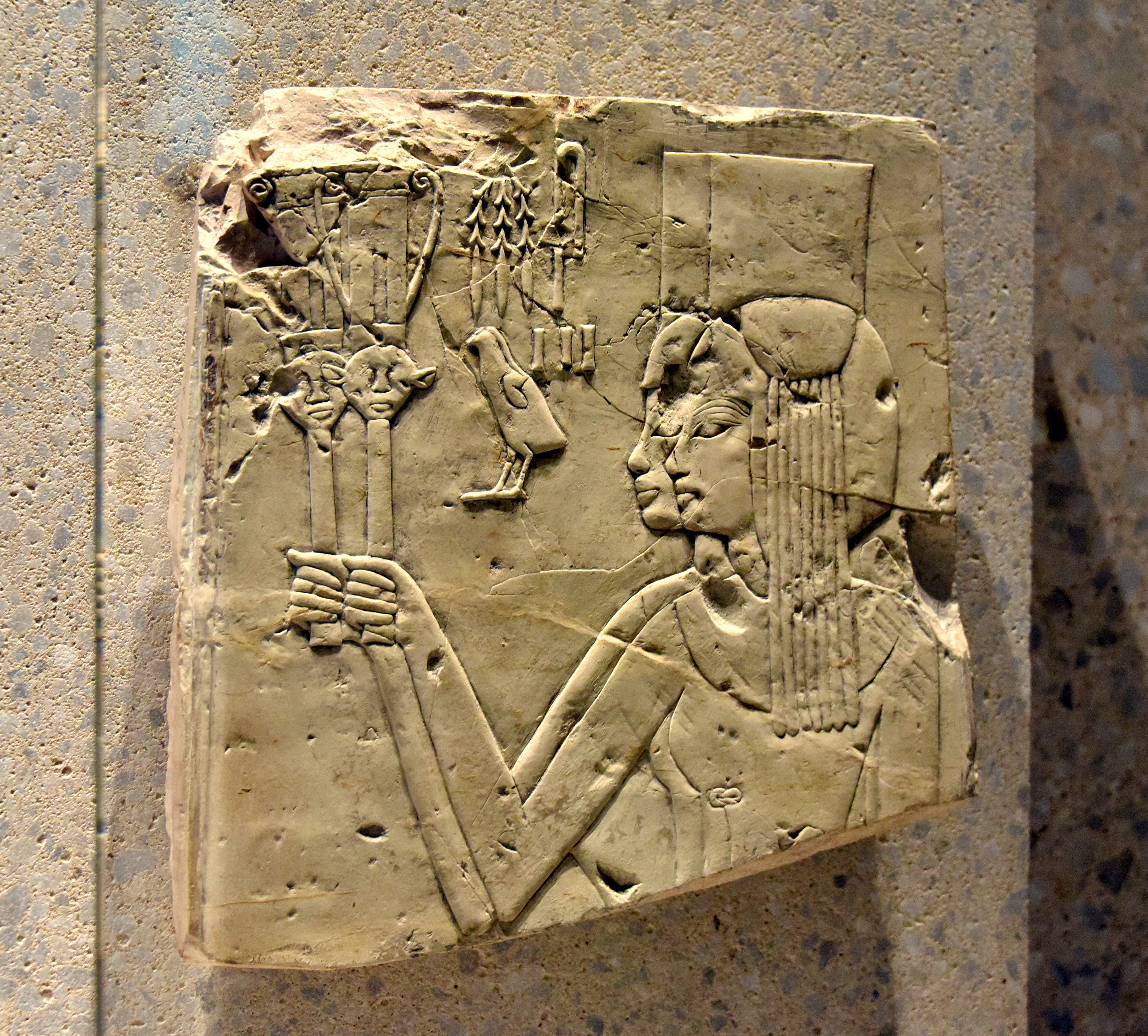 This limestone tomb relief came from the Tomb of Kheruef (TT192) at Western Thebes (in modern-day El-Assasif), Egypt. These two girls are daughters of the Egyptian pharaoh Amenhotep III (c. 1386-1353 BCE) and Queen Tiye (1398-1338 BCE). Kheruef was the steward of Queen Tiye. New Kingdom, 18th Dynasty, c. 1355 BCE. It is on display at the Neues Museum in Berlin, Germany.