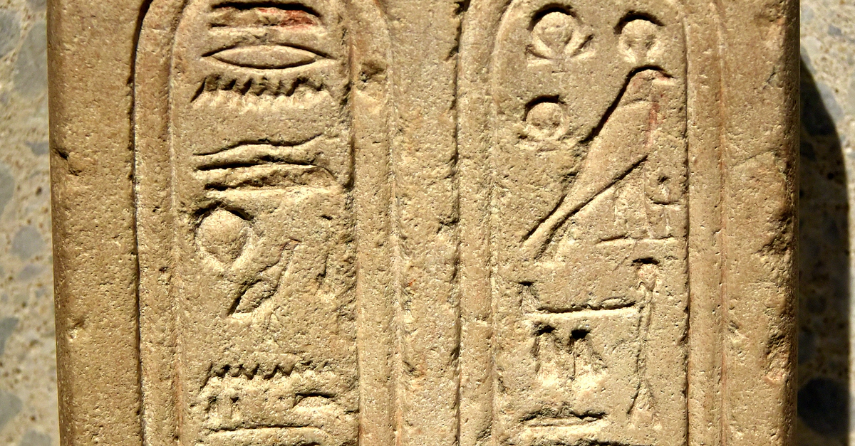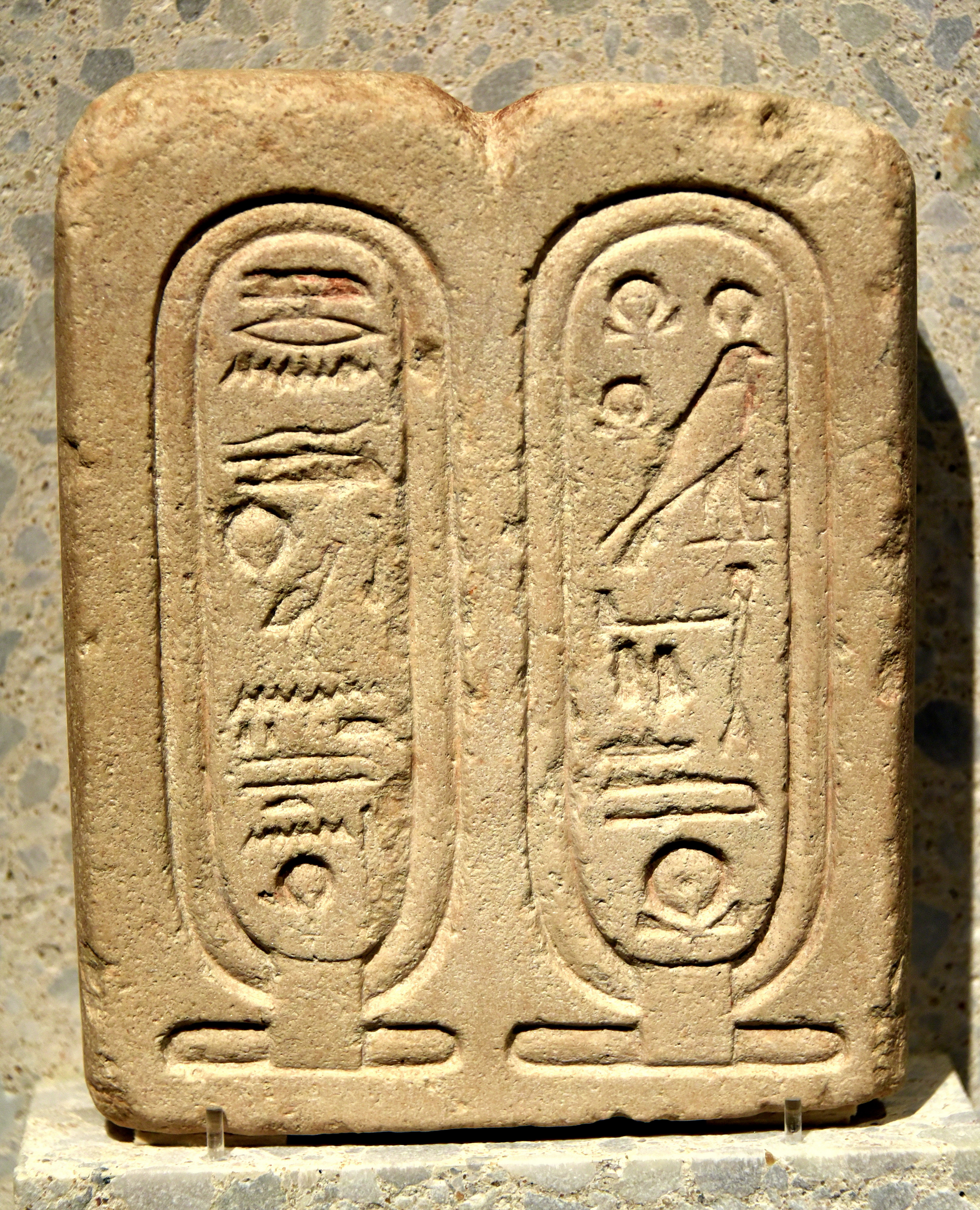 Limestone "early" cartouches of the god Aten. The one on the right reads "The living Re-Horakhty, Rejoicing in the horizon" while that on the left reads "In his name as Shu, who is in the Aten". From small houses, N 49.06, at Amarna, Egypt. New Kingdom, 18th Dynasty, 1351-1334 BCE. It is on display at the Neues Museum in Berlin, Germany.