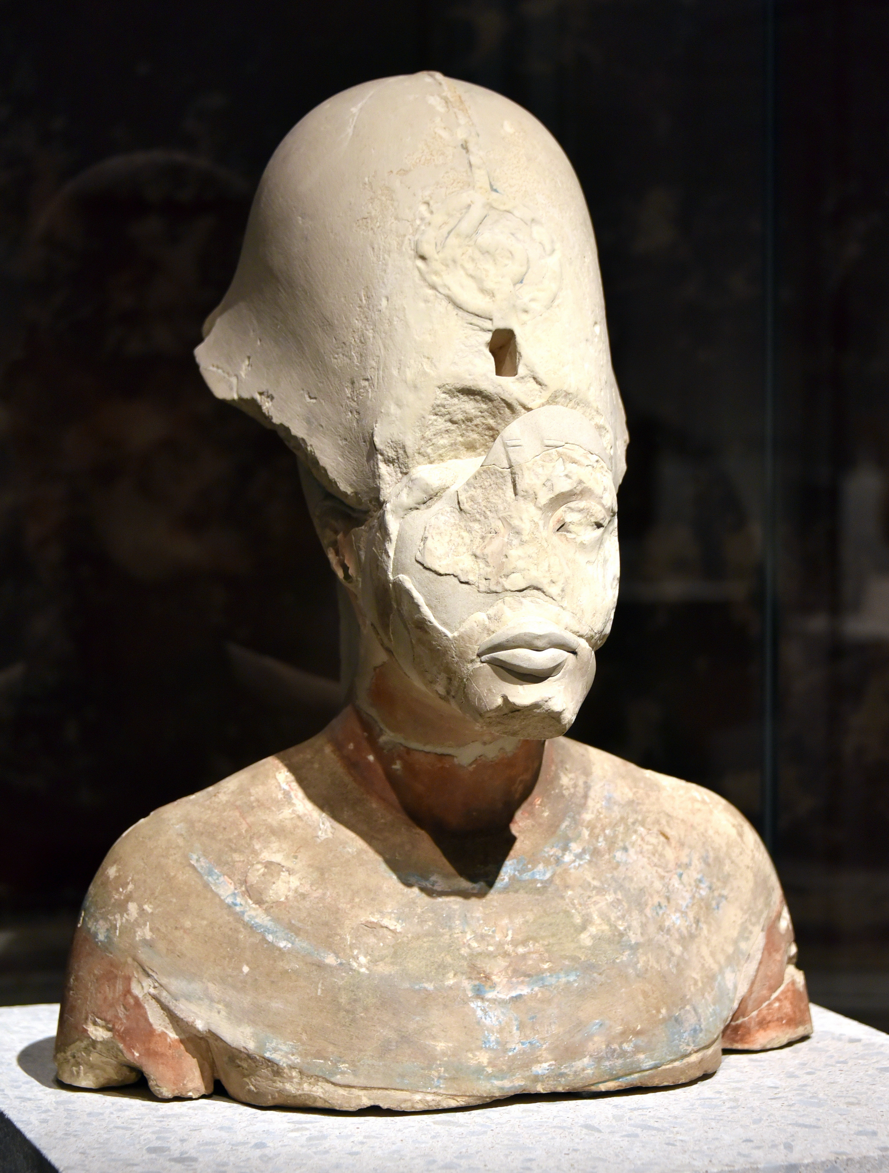This bust of the Egyptian pharaoh Akhenaten (r. 1353-1336 BCE) came from House P 47.2, Room 19 at the city of Amarna, Egypt. Limestone (with additions), painted and gilded. New Kingdom, 18th Dynasty, c. 1340 BCE. Donated by James Simon (1851 - 1932 CE) in 1920 CE. It is on display at the Neues Museum in Berlin, Germany.