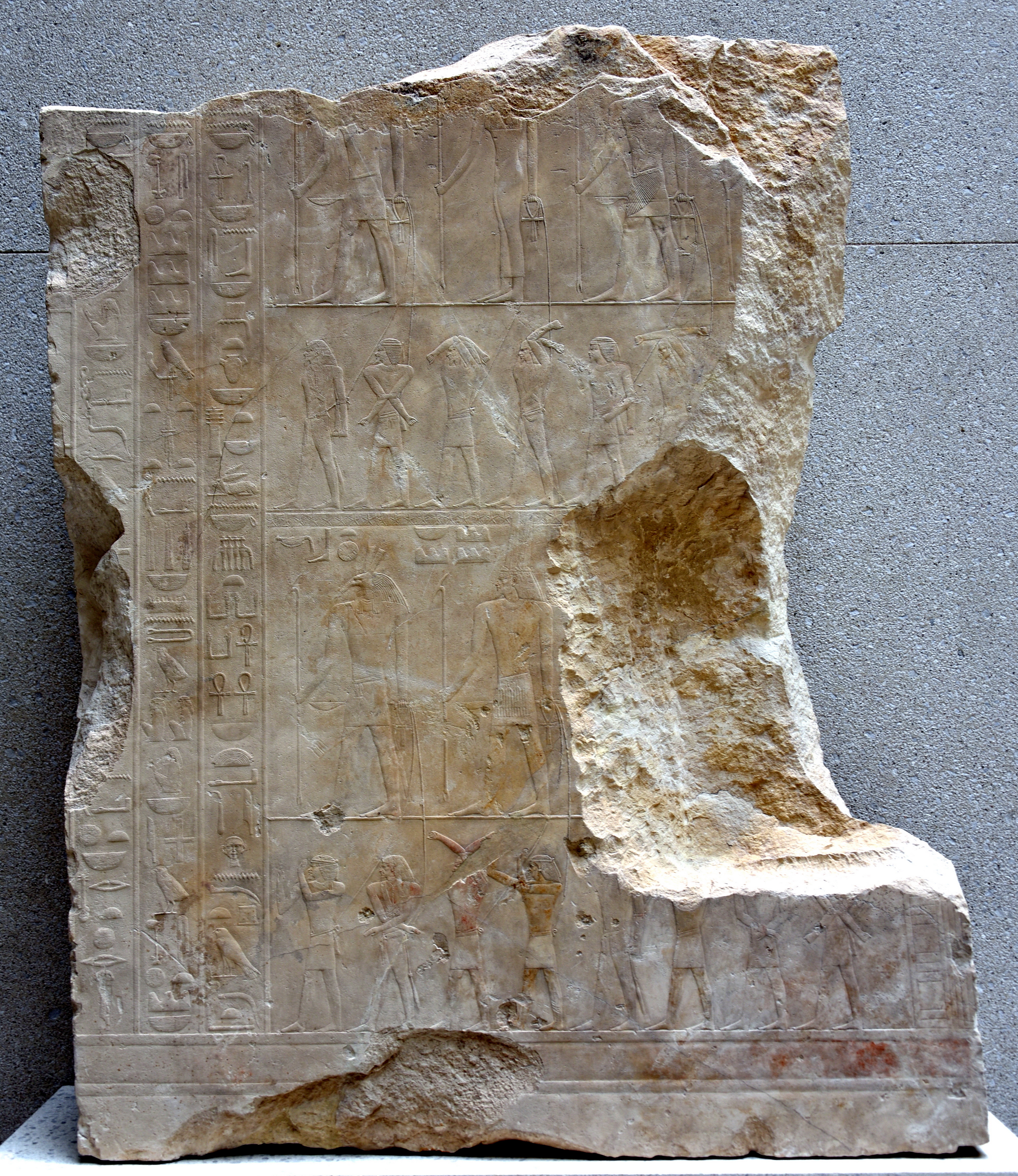 This large fragment came from the Pyramid of Pharaoh Sahure (25th Century BCE) at Abusir, Egypt. Four registers can be recognized. The gods Seth and Sopdu present captives or prisoners to Sahure; Sahure was the 2nd ruler of the 5th Dynasty. Old Kingdom, 5th Dynasty, 2496-2483 BCE. It is on display at the Neues Museum in Berlin, Germany.
