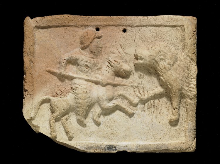 Baked clay perforated plaque showing a heavily armoured horseman (cataphract) wearing scale or lamellar armour and a "coal skuttle" helmet, spearing a lion. 3rd century BCE - 2nd century CE British Museum