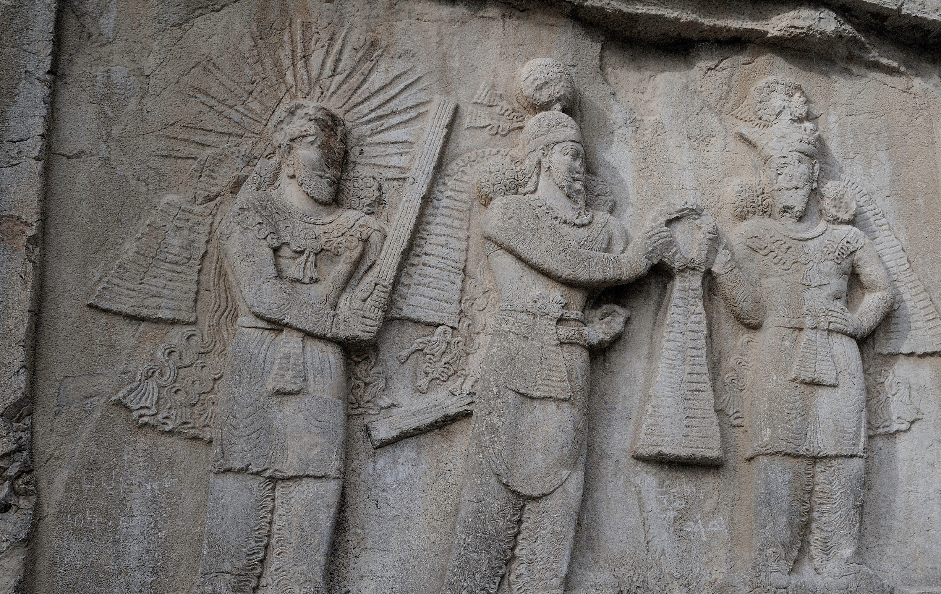 A 3rd Century CE bas-relief in Taq-e Bostan, Iran commemorating the overthrow of the Parthian Empire by Ardashir I (180-240 CE, r. 224-240 CE), the founder of the Sasanian Empire. Ardashir I is depicted with his son Shapur I, (215-270 CE, r. 240-270 CE) as they symbolically trample their defeated enemy, Artabanus IV (r. 213-224 CE).