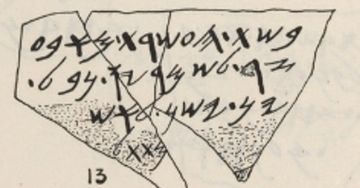 A facsimile of an ostracon discovered at Samaria, dating to the 8th century BCE. The writing is ancient Hebrew. George Andrew Reisner. Harvard Excavations at Samaria, 1908-1910. Cambridge: Harvard University Press, 1924.