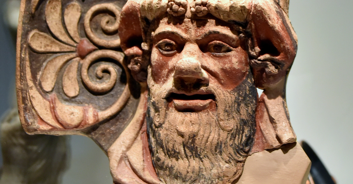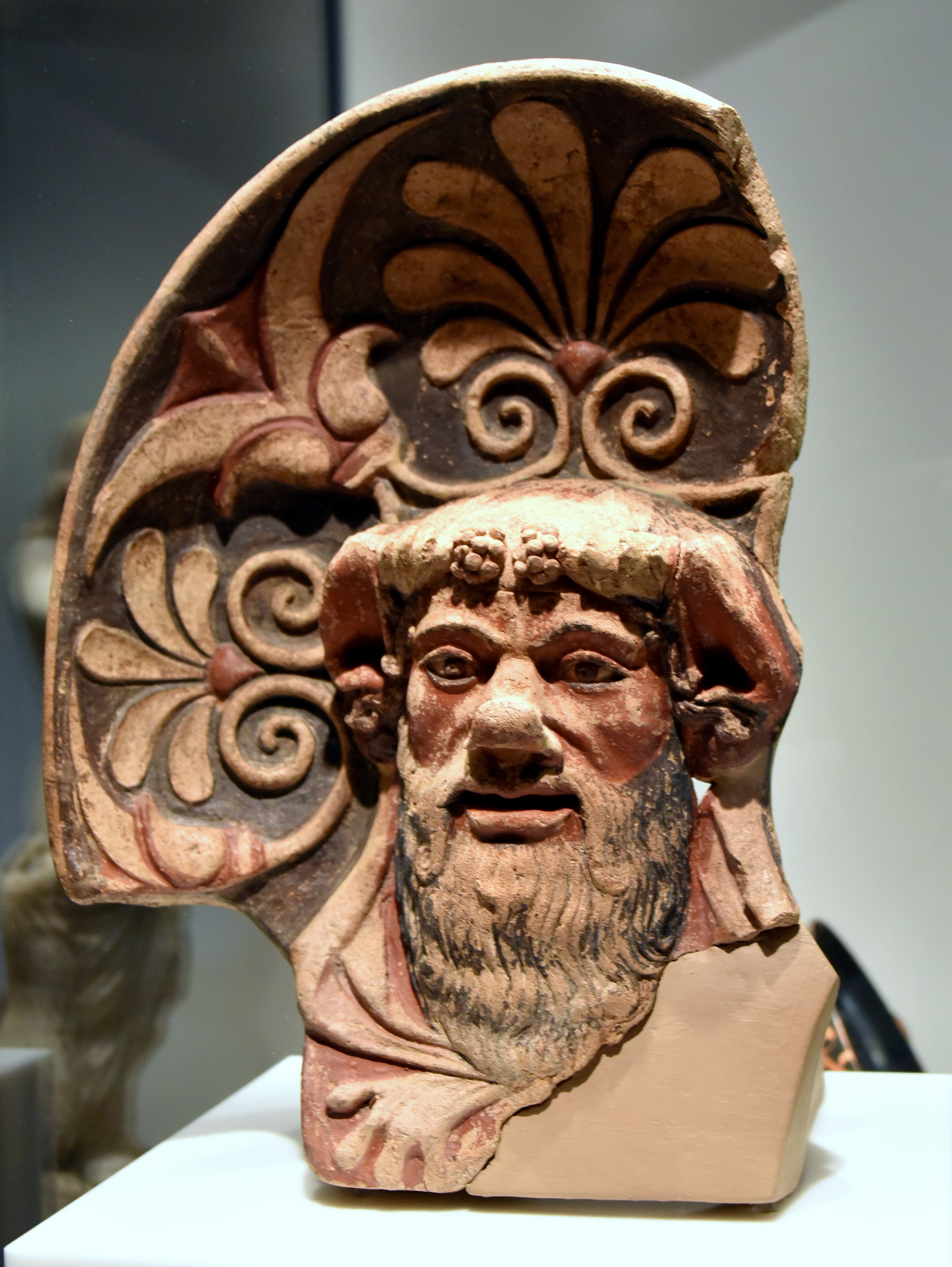 Etruscan antefix with a head of Silen and anthemia nimbus from Cerveteri, Lazio, Italy. The roofs of Etruscan temples were decorated along their eaves with antefixes, ornamental tiles with figural reliefs. They were serially produced in large quantities using matrices with a high level of fidelity. From the early 5th century BCE onward, antefix heads were framed by an ornamental nimbus. 4th century BCE. (The Neues Museum, Berlin, Germany).